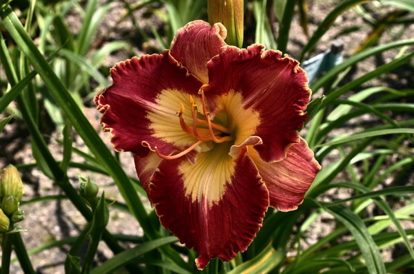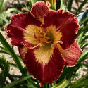 fire brick red self, large dark blood red eye, dark and blue gray marginal bands along the ruffled edge, narrow golden edging, green throat, blue gray midribs
