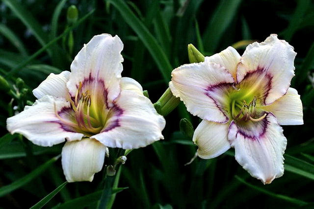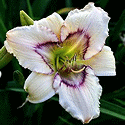 near white with rosy and creamy shades, dark lemon green throat, large violet eye and edge tinged with dark royal purple, outer white toothy edging, large creamy white sepals