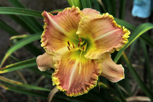 polychrome ruddle pink, orange near vermillon halo, green and yellow throat, bright golden ruffled edge, narrow white midribs
