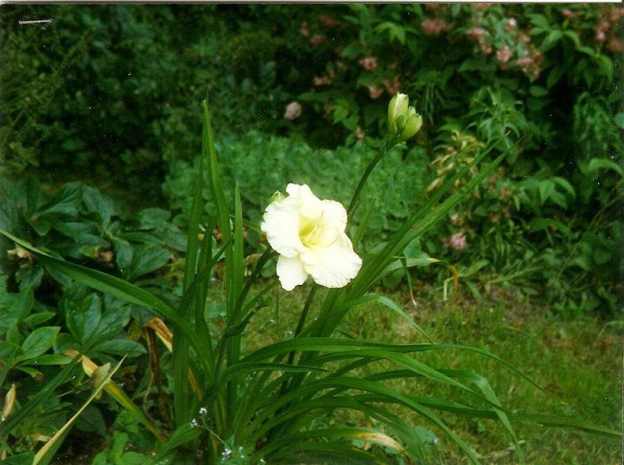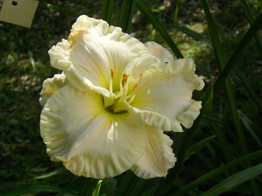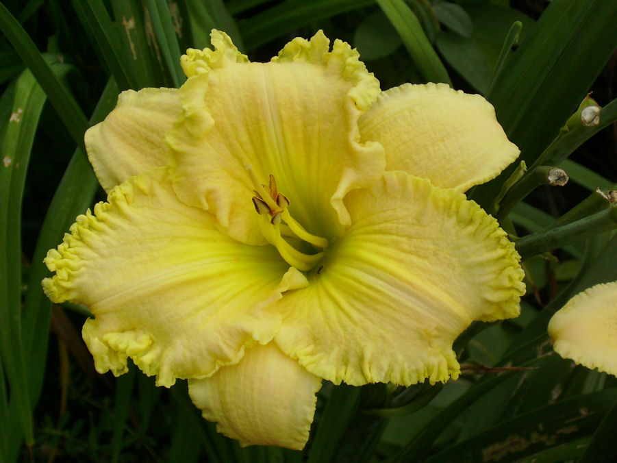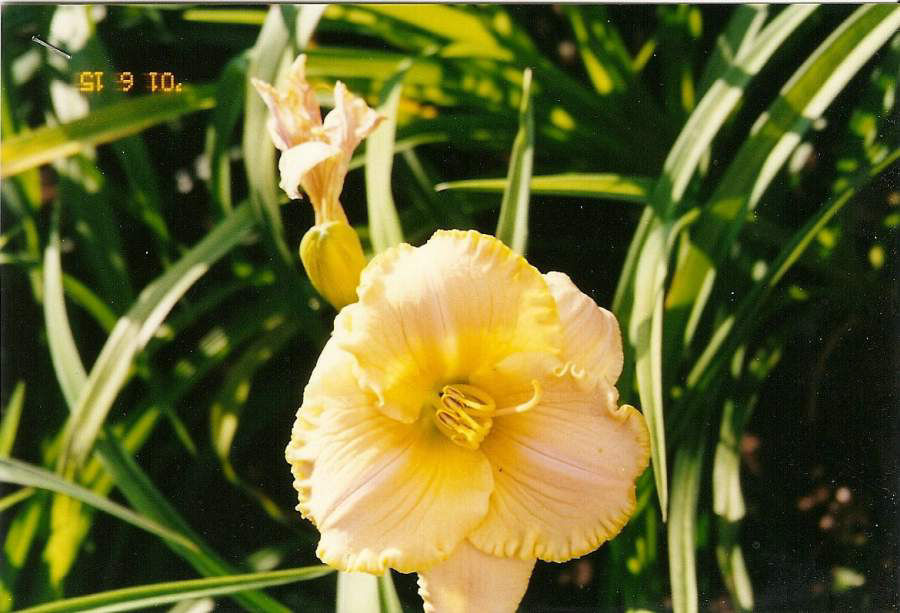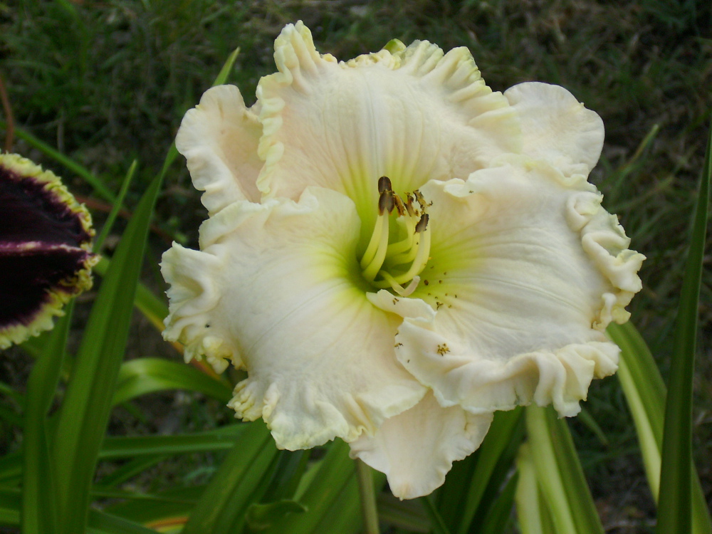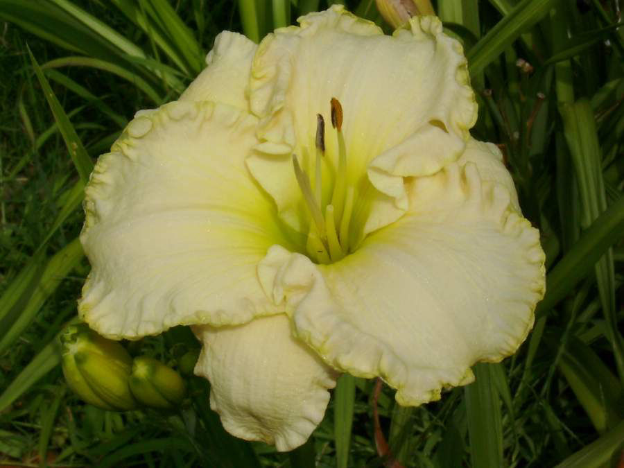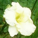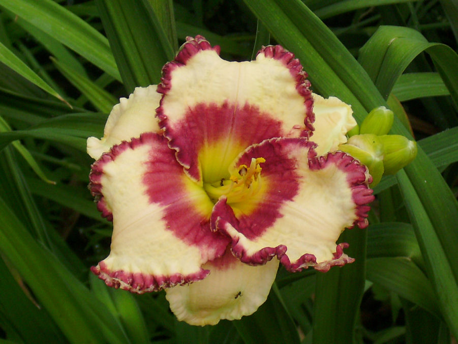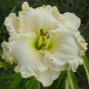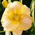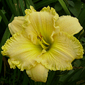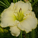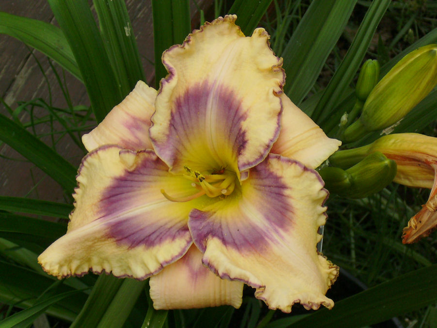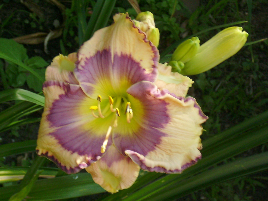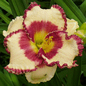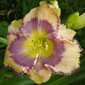 cream yellow with blue lavender eye and picotee, amber shading to green throat