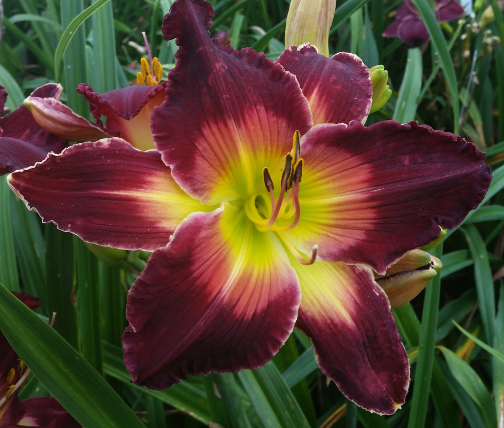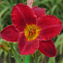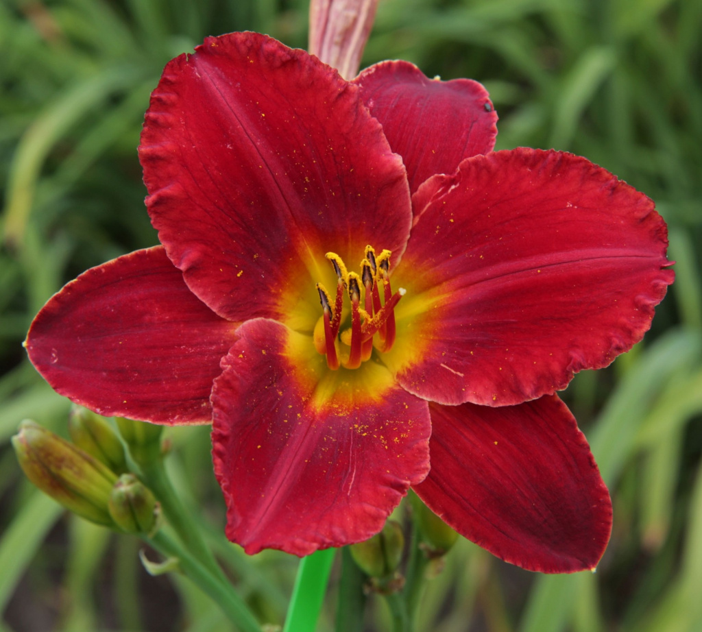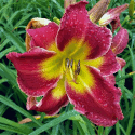 scarlet red with garnet red band above yellow green throat, slightly ruffled lighter edge with small teeth