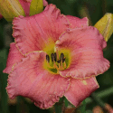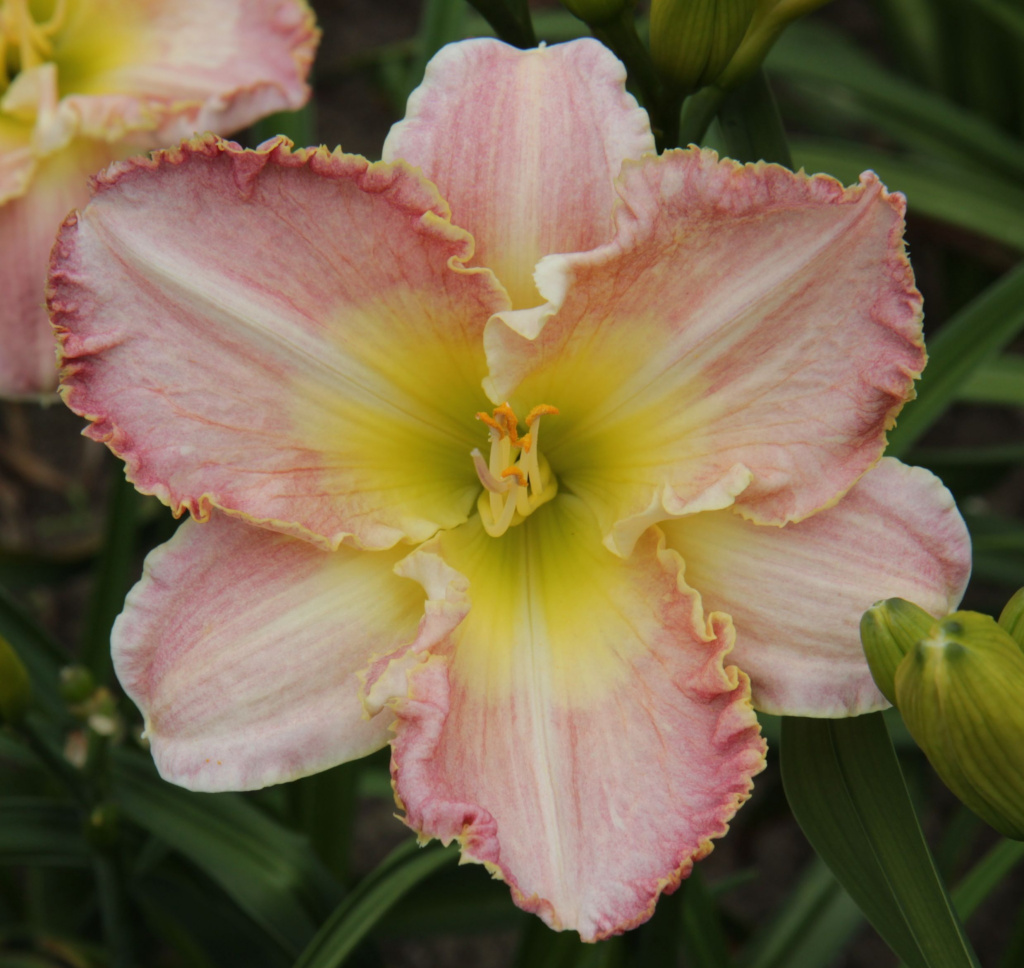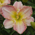 pink with slightly darker eyezone, yellow to green throat, lightly ruffled, narrow double edge