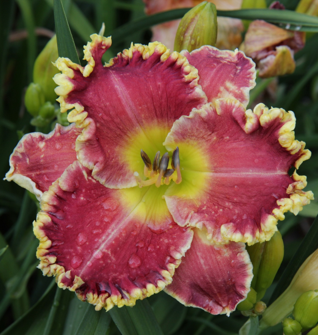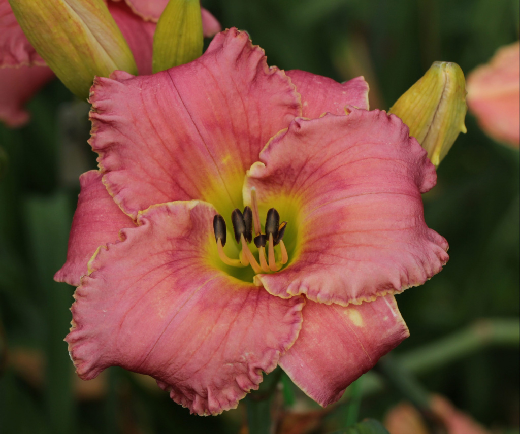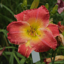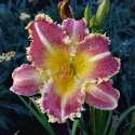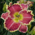 blend of punch to ruby pink with with heavily ruffled, contrasting yellow edge, yellow to lime green throat, can be paler in color