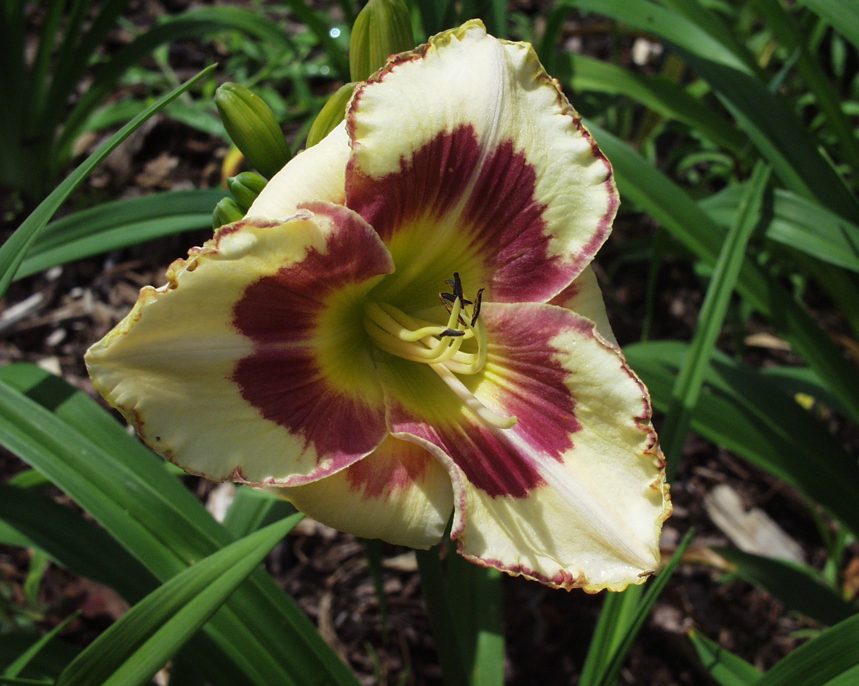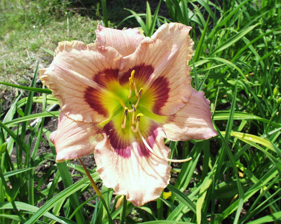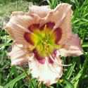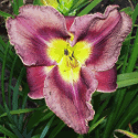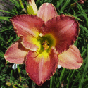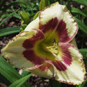 yellow-white blend, purple eye, gold and purple edge, green throat
