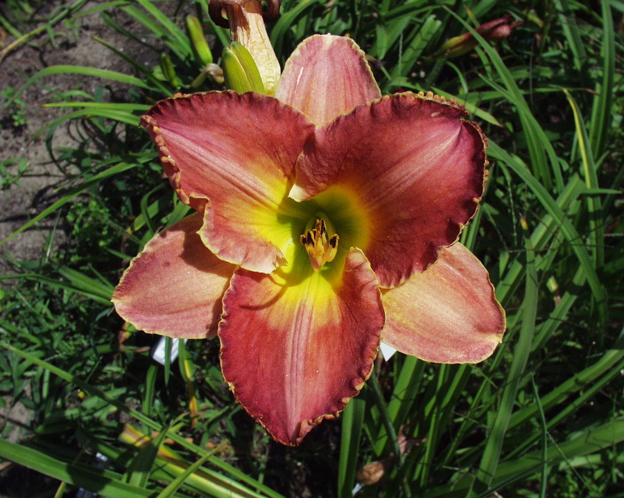 petal red-violet blend, sepals light red-violet blend, gold edge, green throat