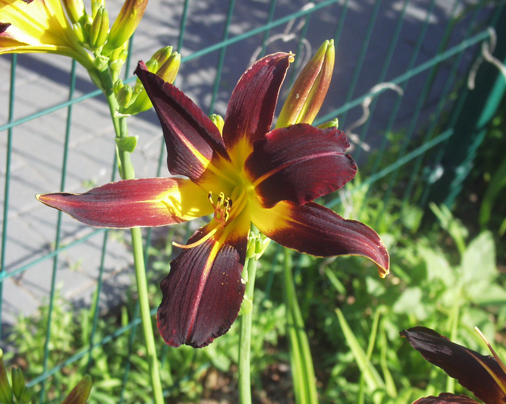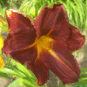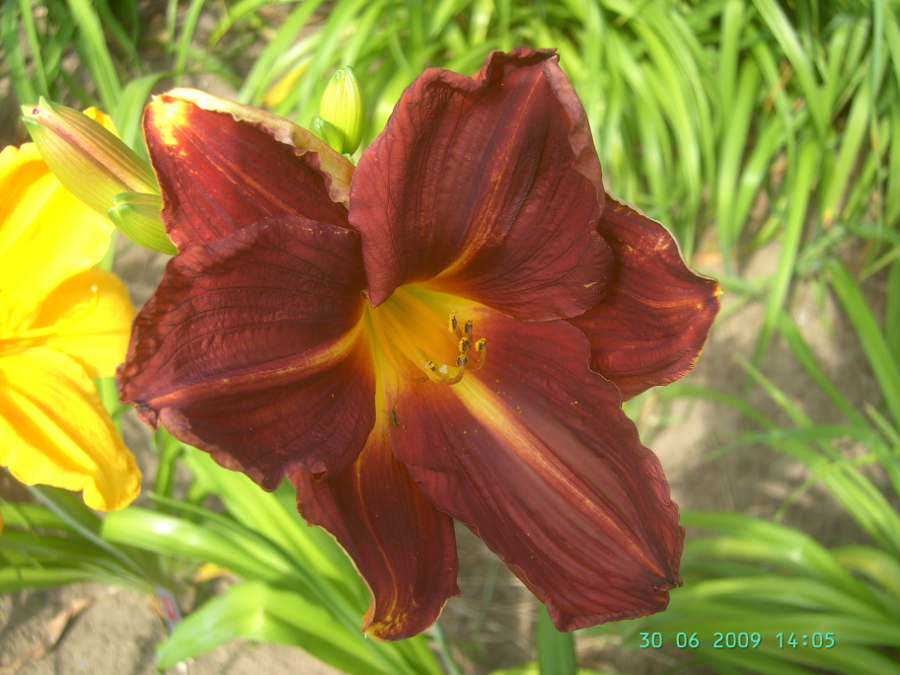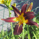 dark brown-wine-red, yellow line of petal, yellow throat