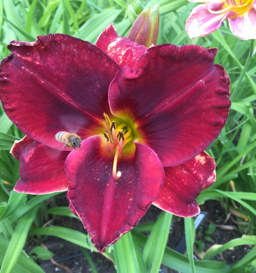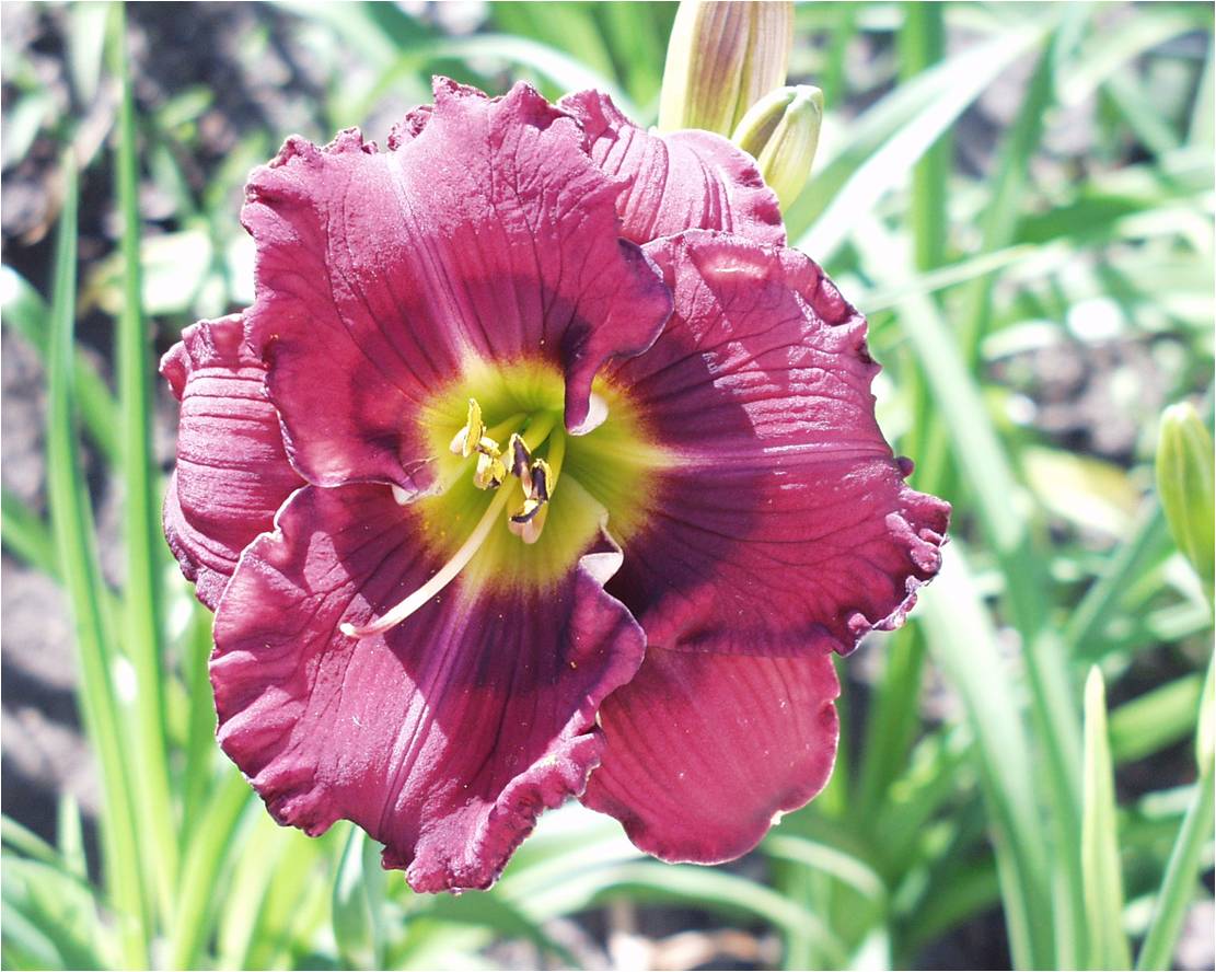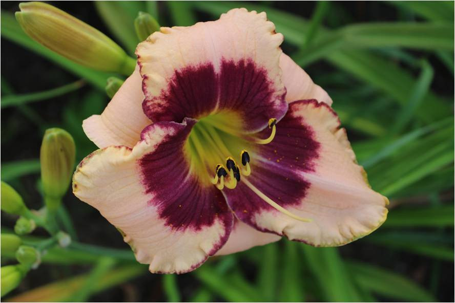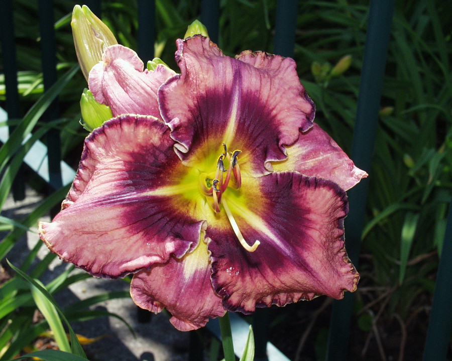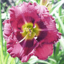 bright purple, dark purple eye, dark purple edge with gold, green throat