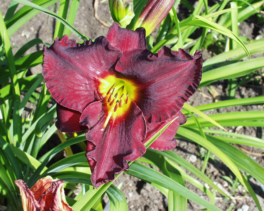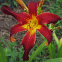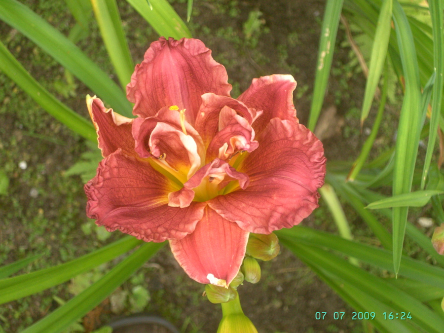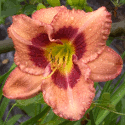 melon-red blend, violet egde, dark wine-red eyed, yellow-green throat