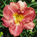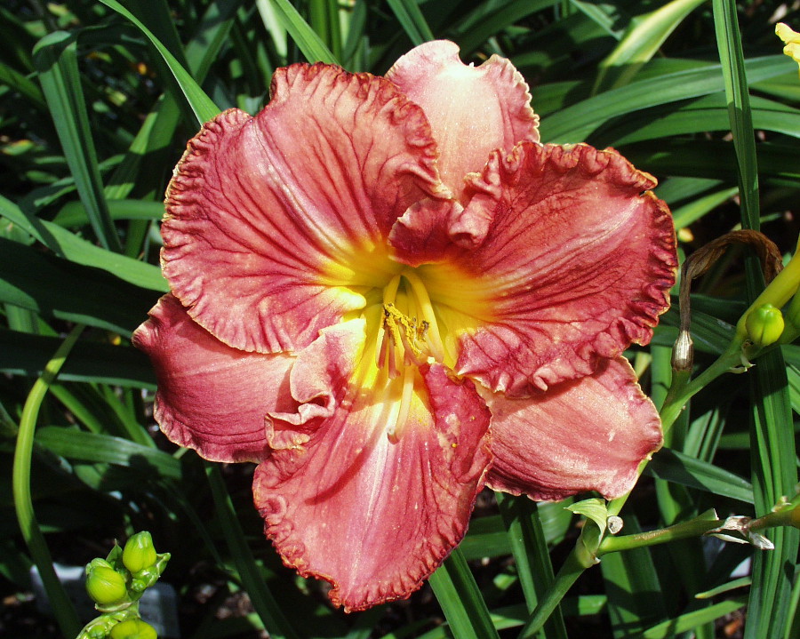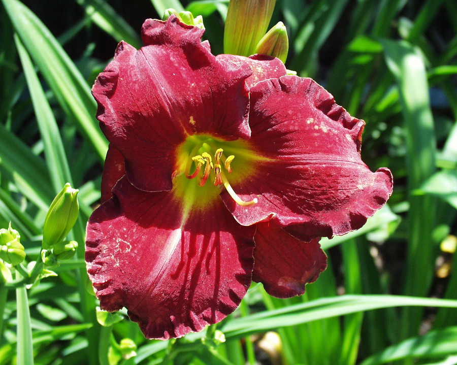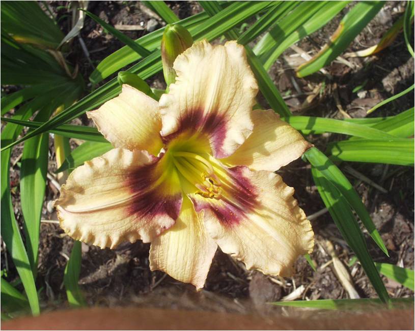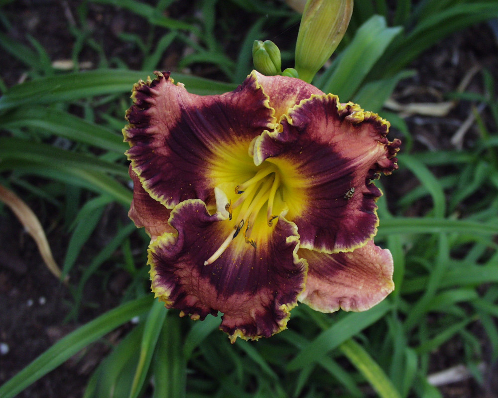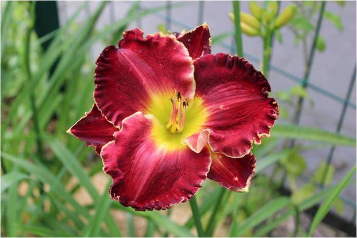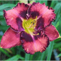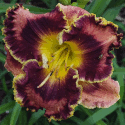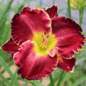 burgundy with darker eye, golden serrated edge, and yellow green throat