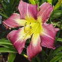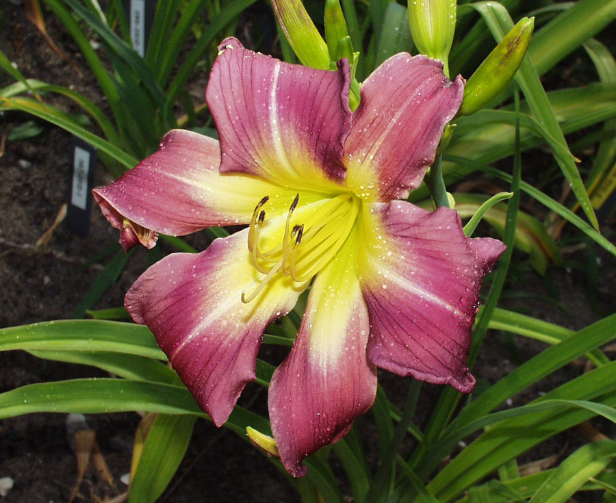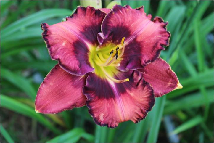 violet red blend, dark violet eye and inner rim, golden outer edge, green throat