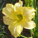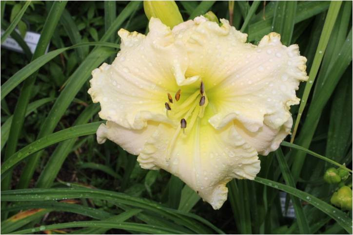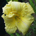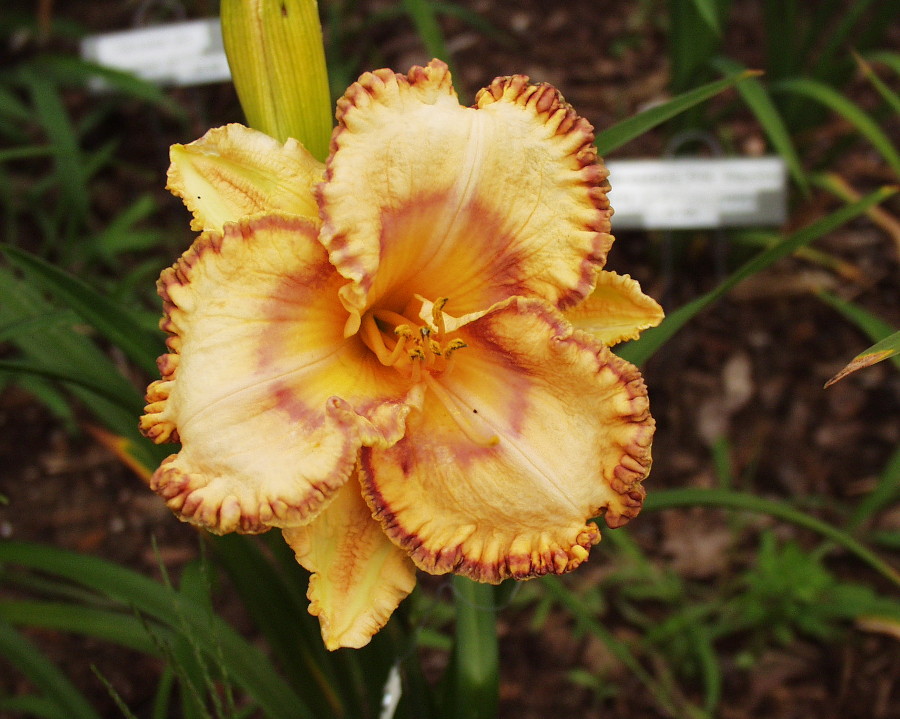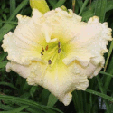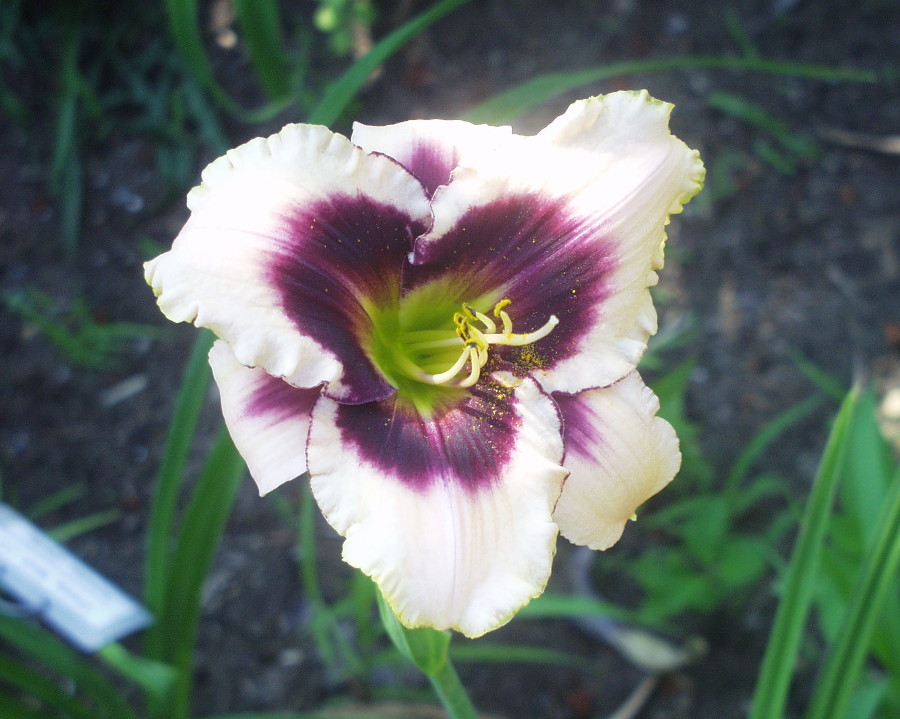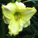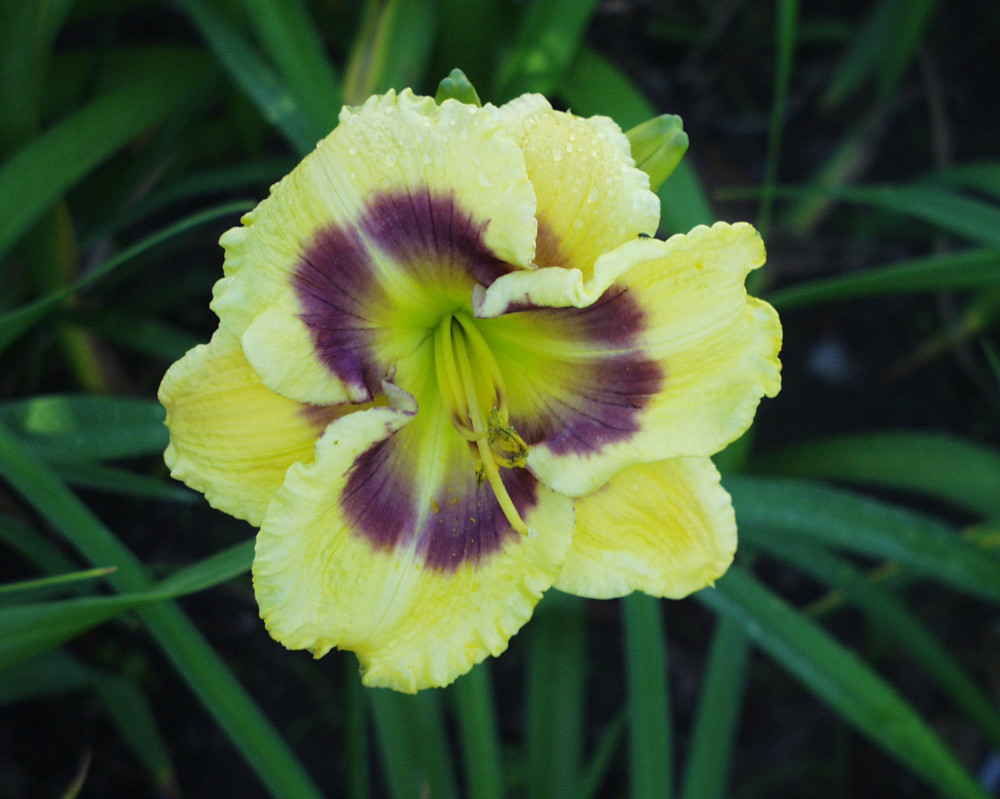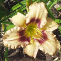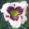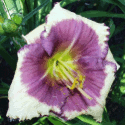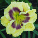 yellow white blend, large violet eye, yellow to green throat, violet edge