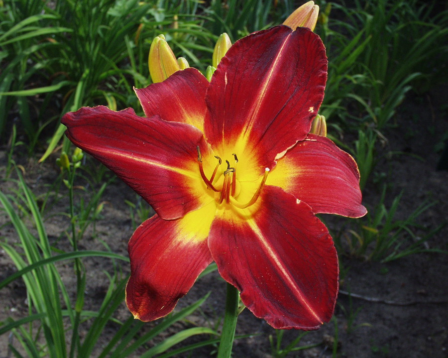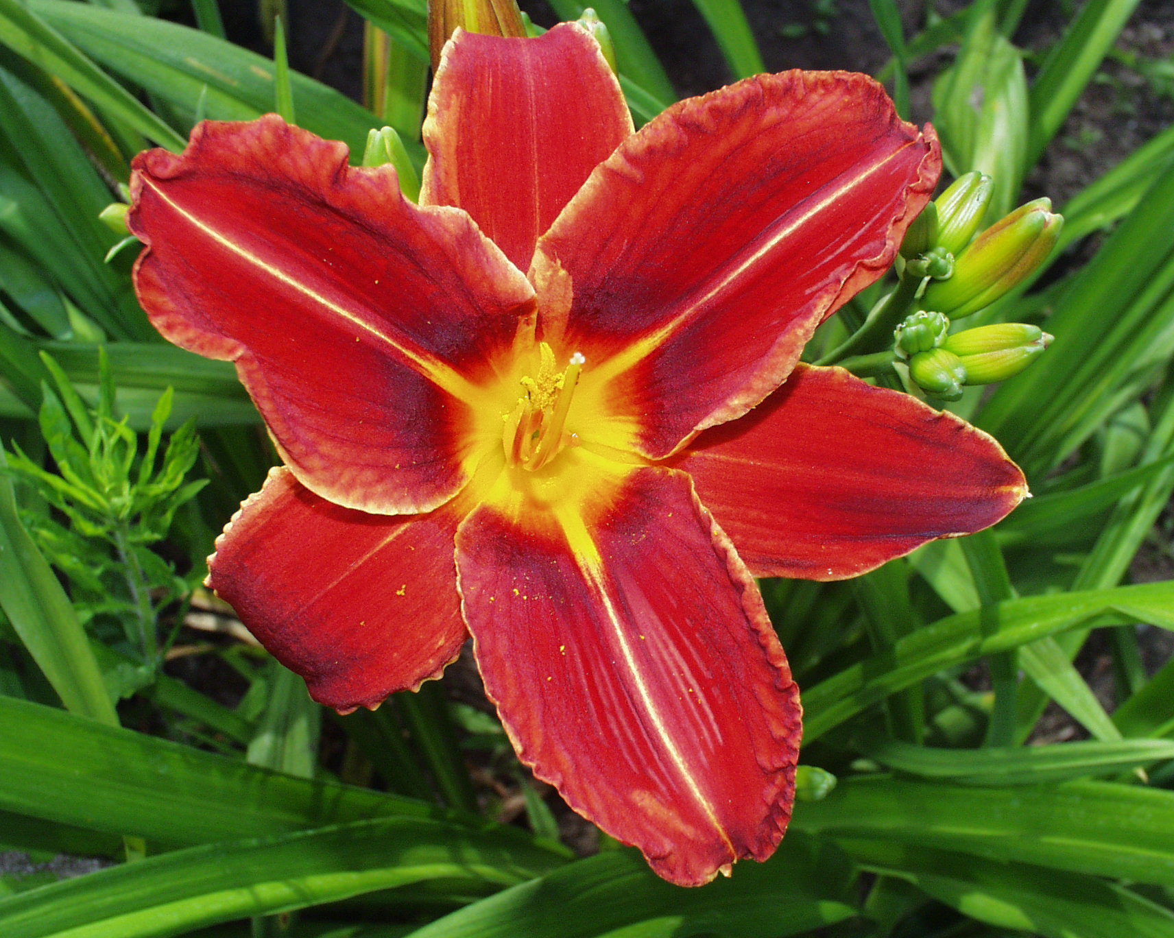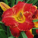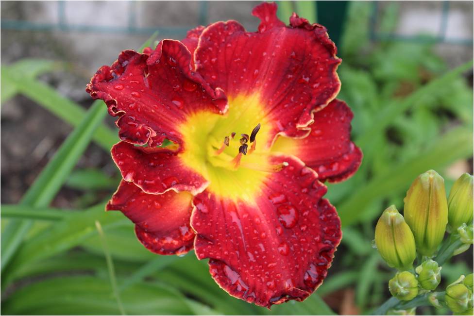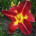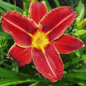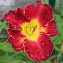 bright red, burgundy eye, golden edge, yellow green throat