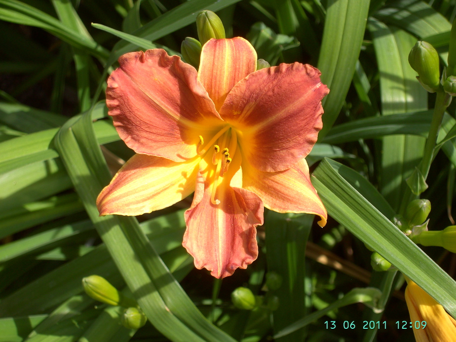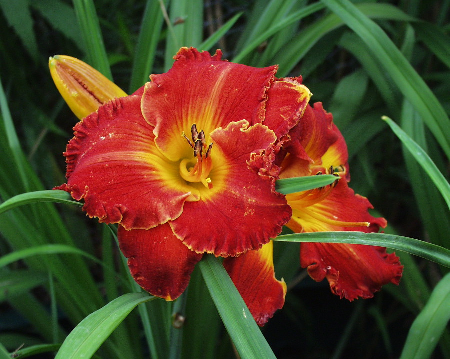 sepal carmine-red, petal red-yellow blend, yellow throat