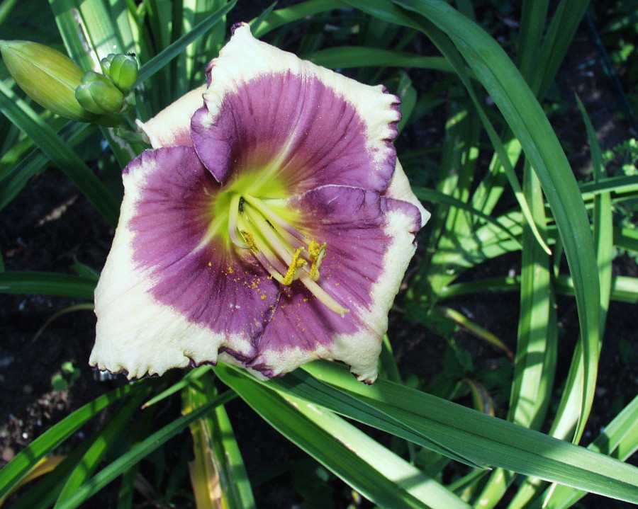 bright yellow violet blend, dark violet eye and edge, green throat