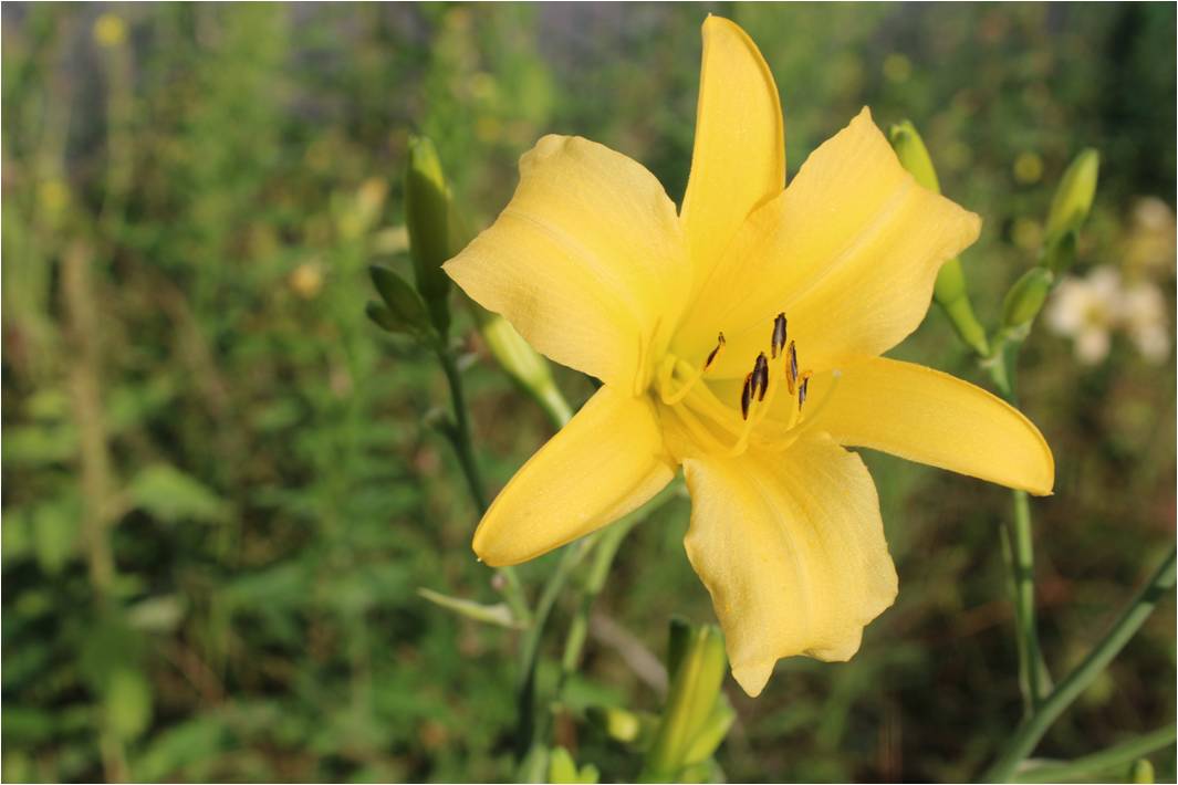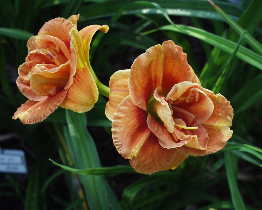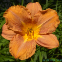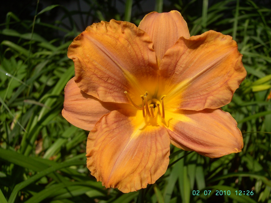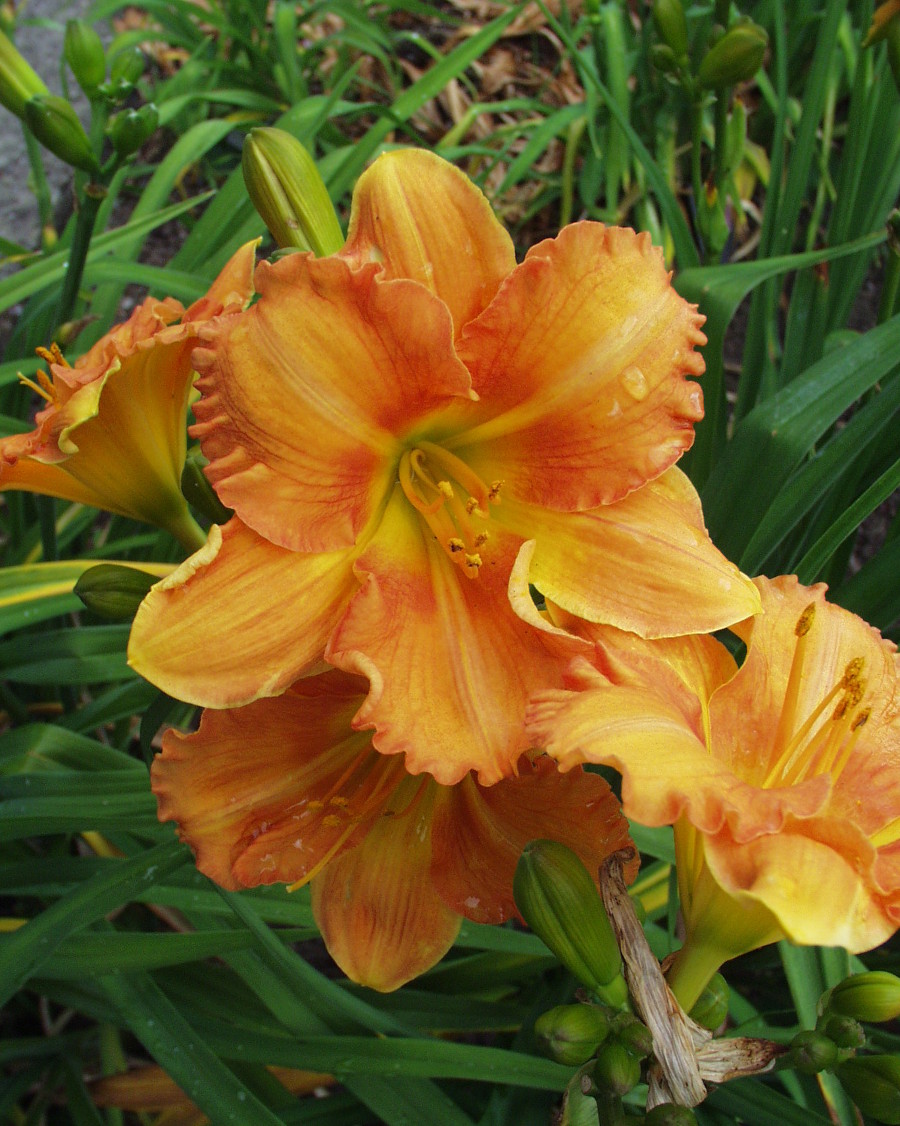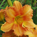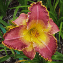 red orange yellow blend, red orange petal edge, yellow lines on petals, and small yellow green throat