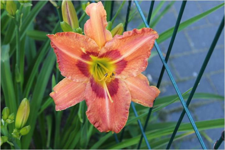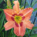 brown orange blend, brighter sepals, red violet eye and edge, green throat