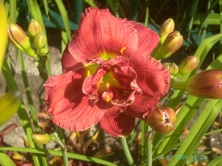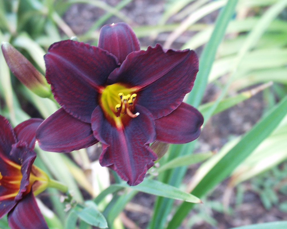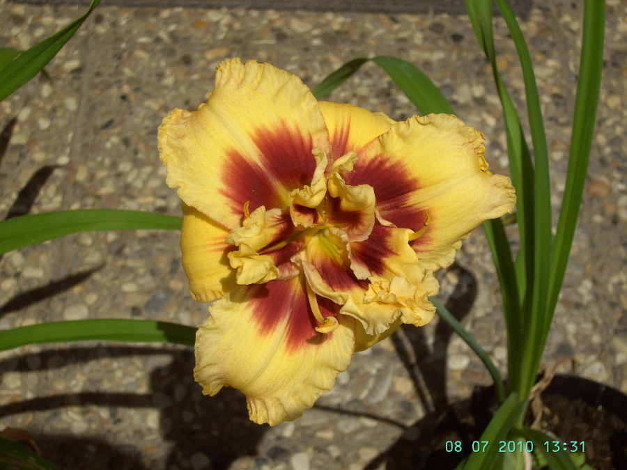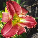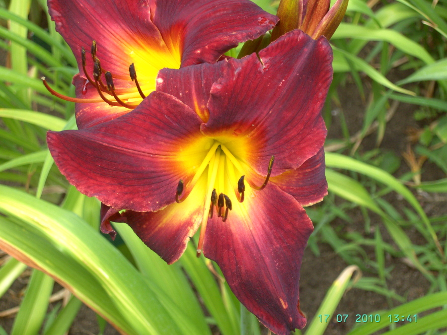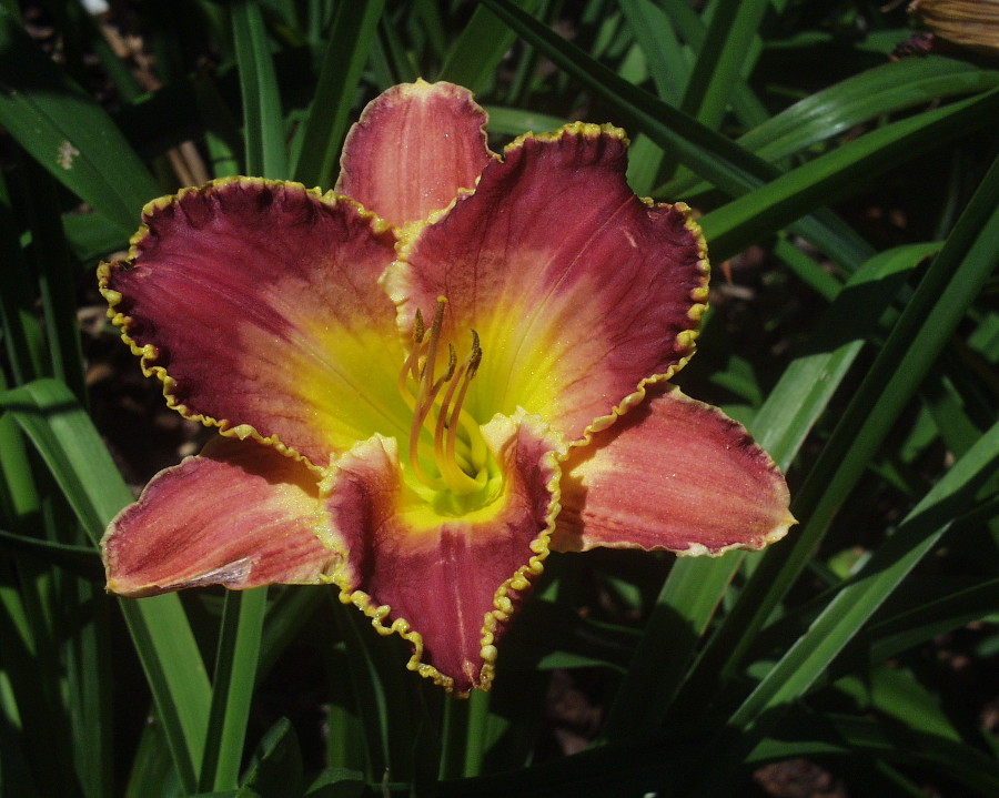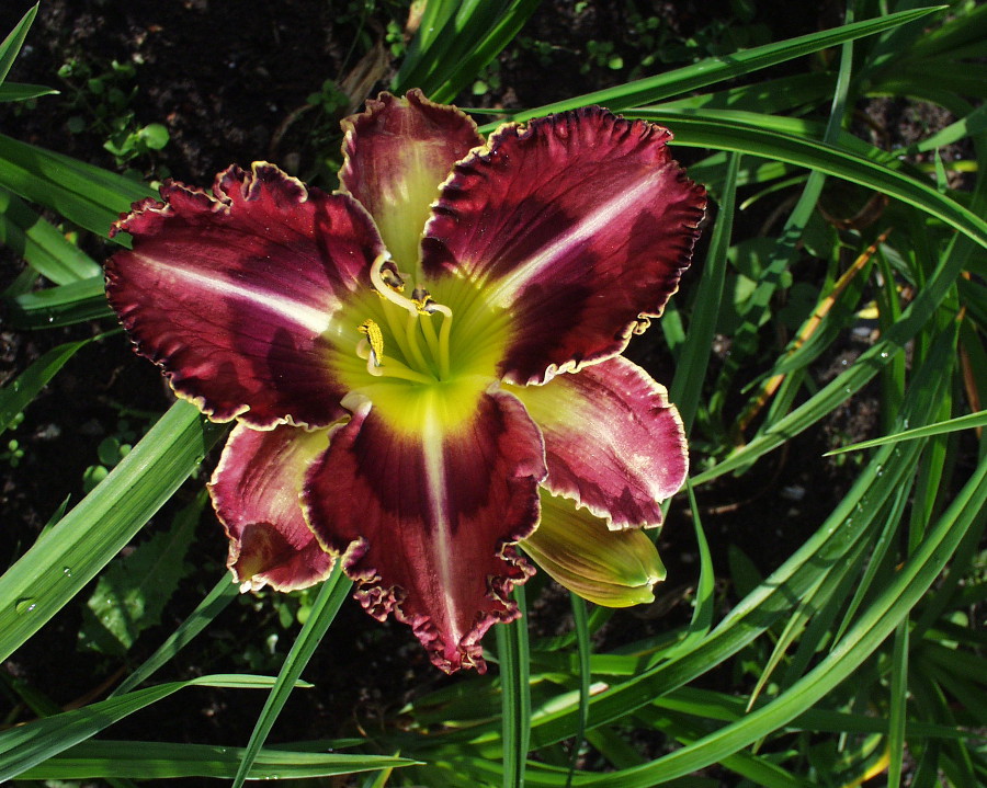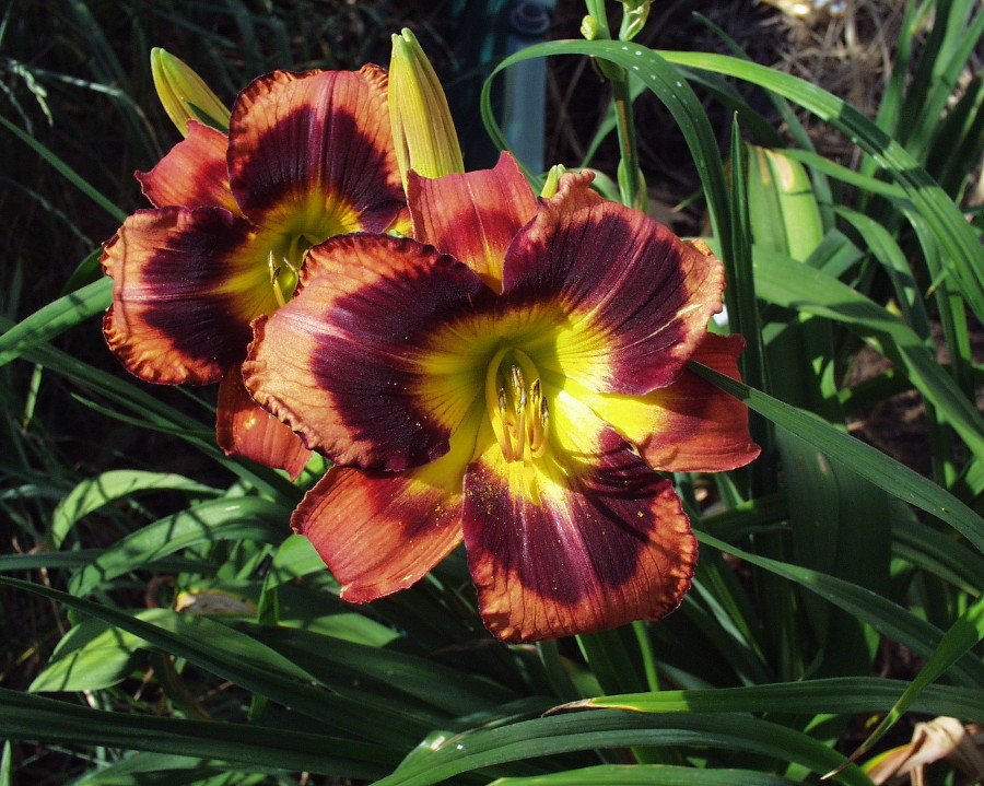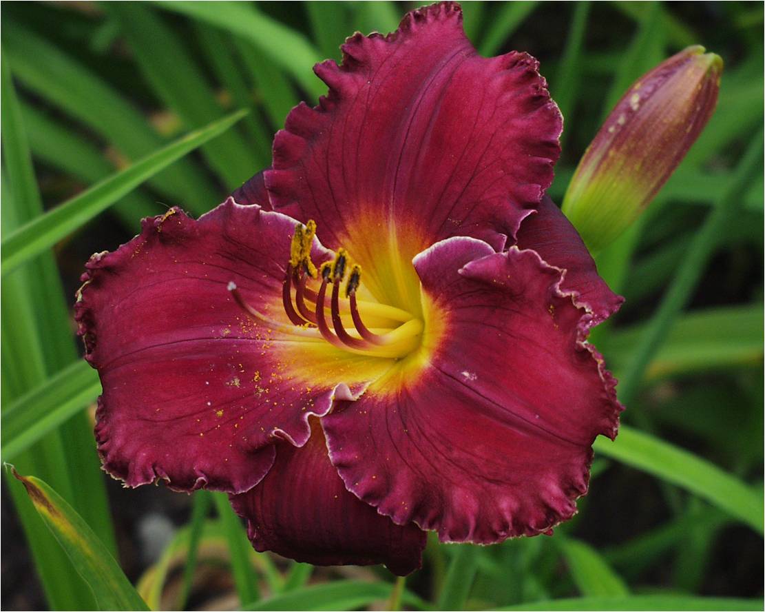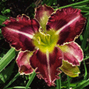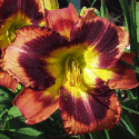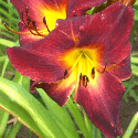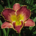 dark burgundy, burgundy yellow blend sepals, golden edge, yellow green throat