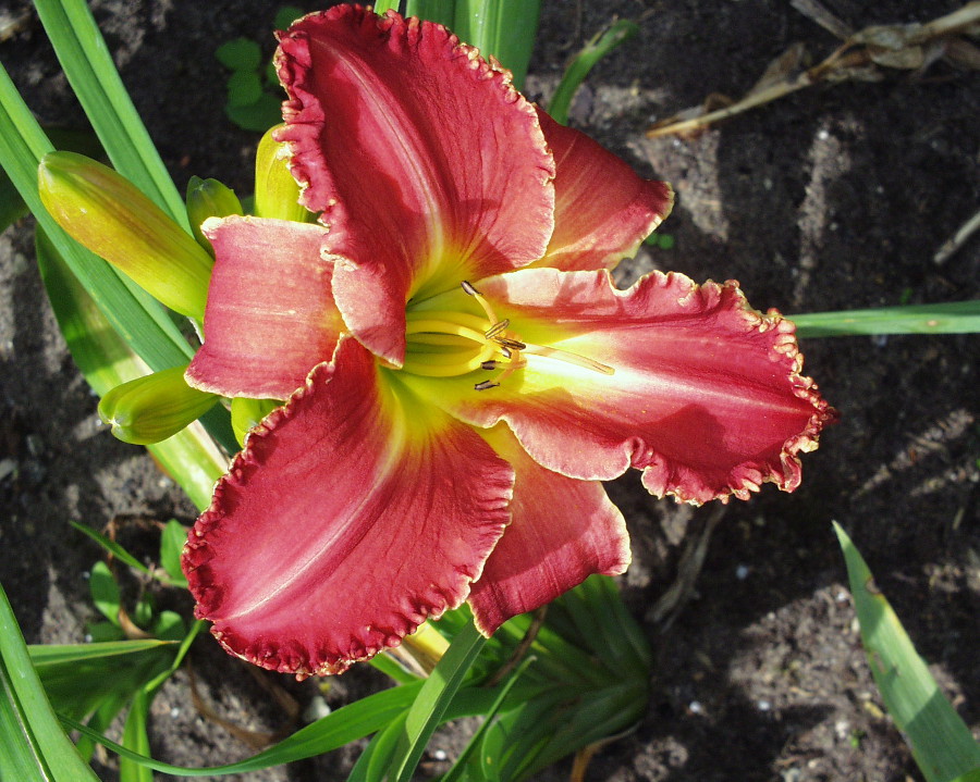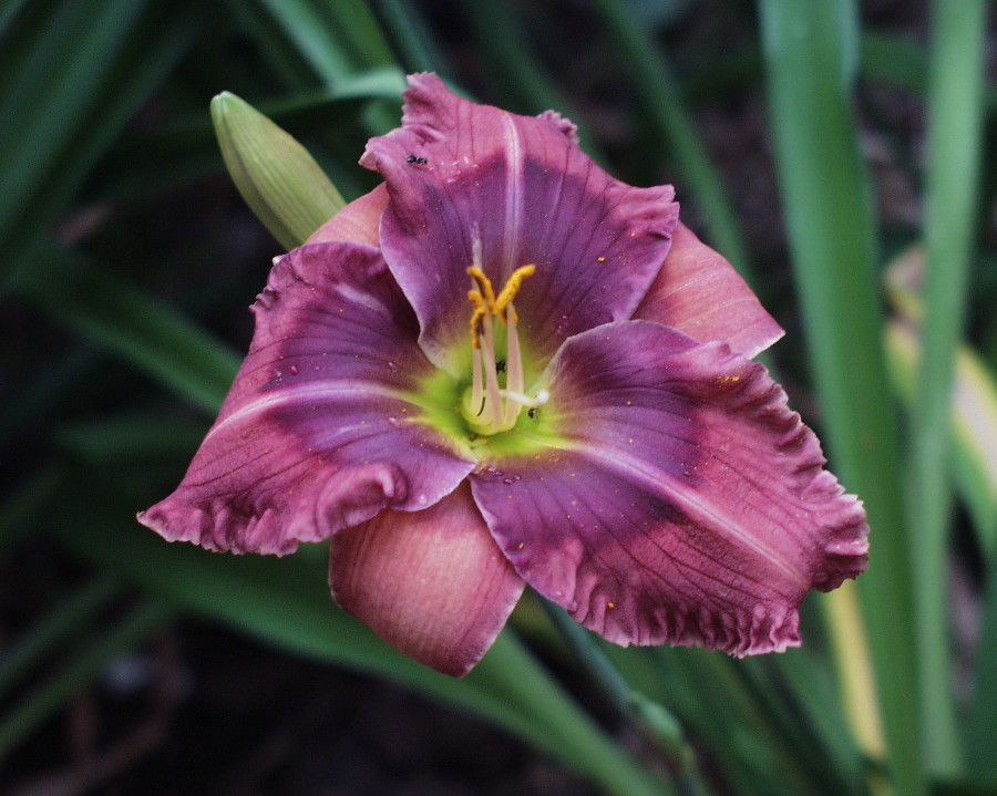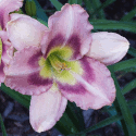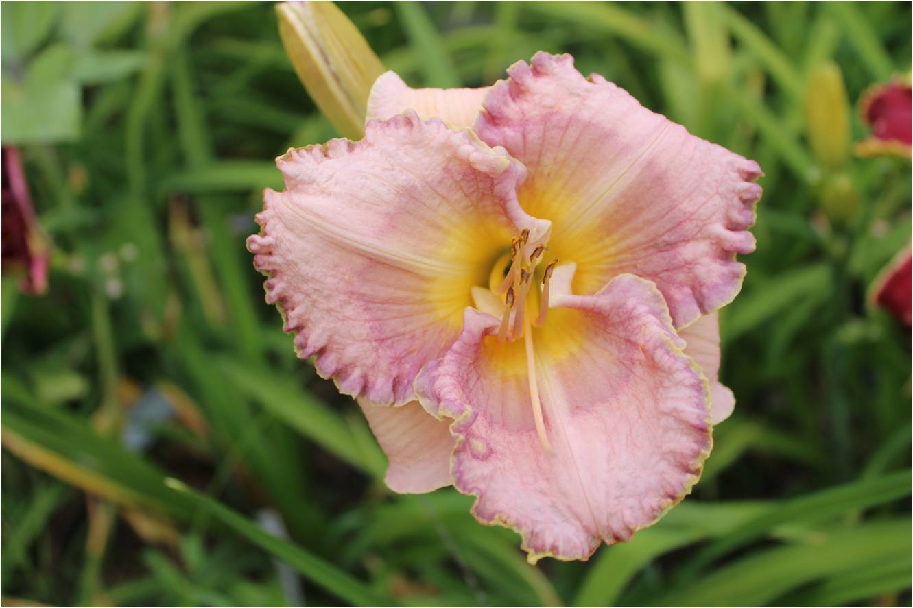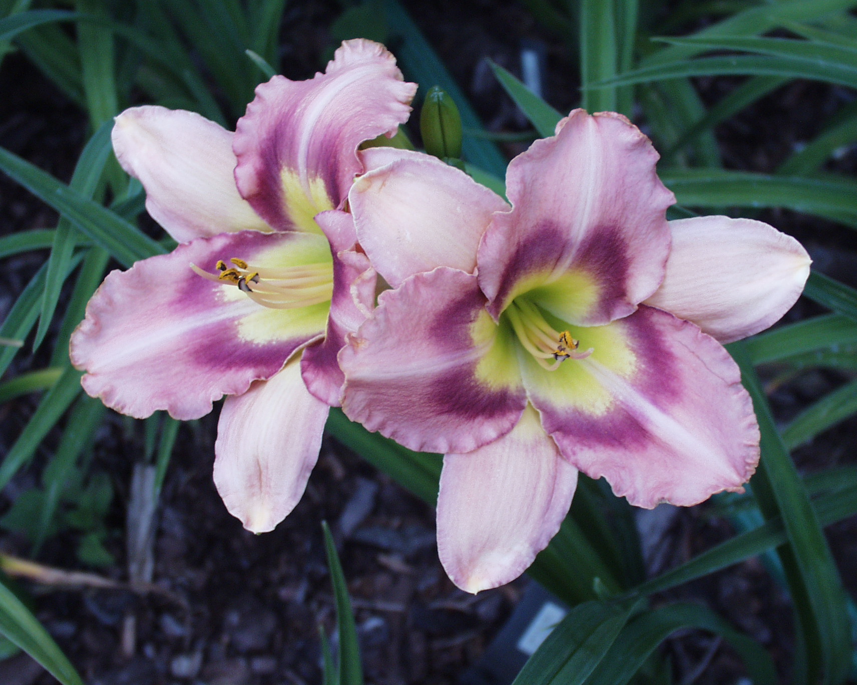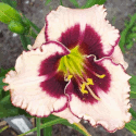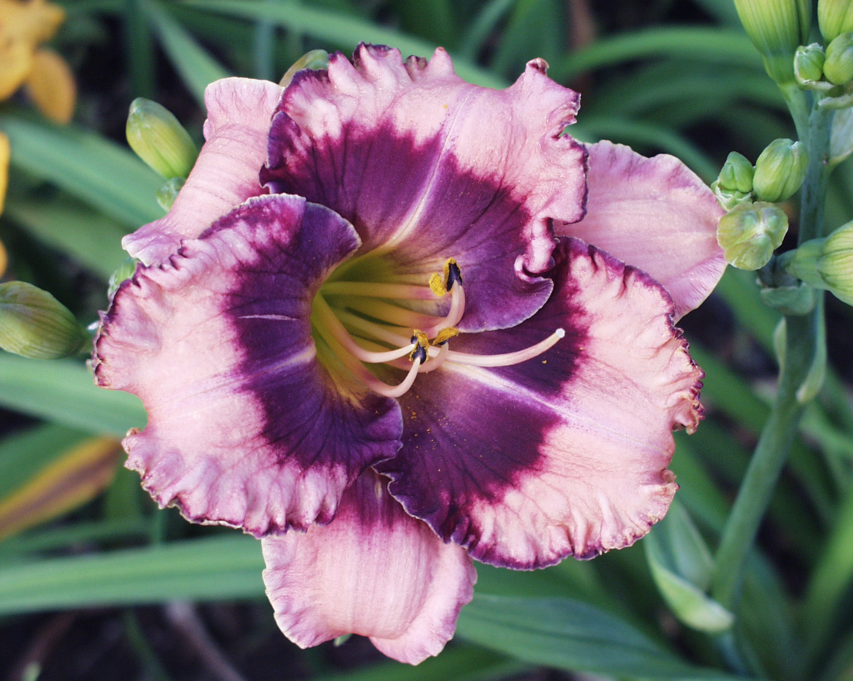 pink-violet blend, dark wine red violet eye, yellow green throat