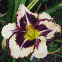 yellow white blend, dark violet to red eye, dark violet edge, green throat