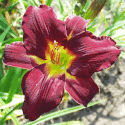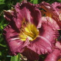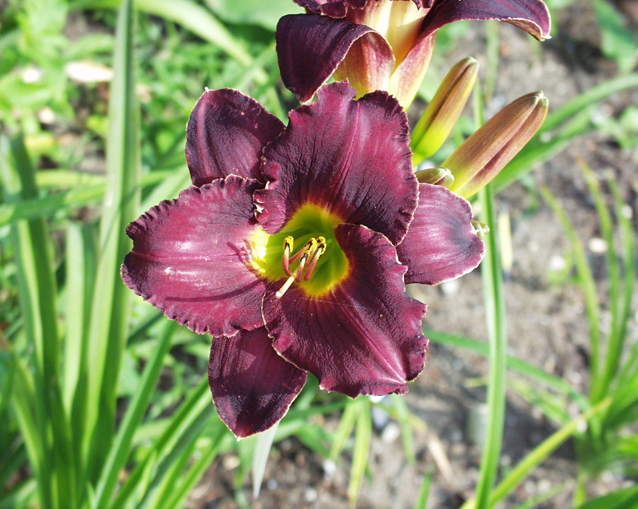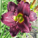 dark carmine purple blend, brighter eye, golden serrated edge, green throat