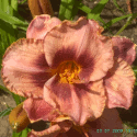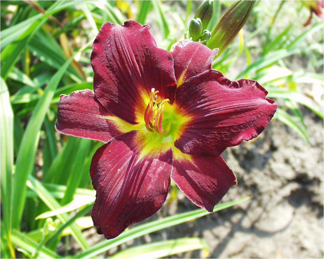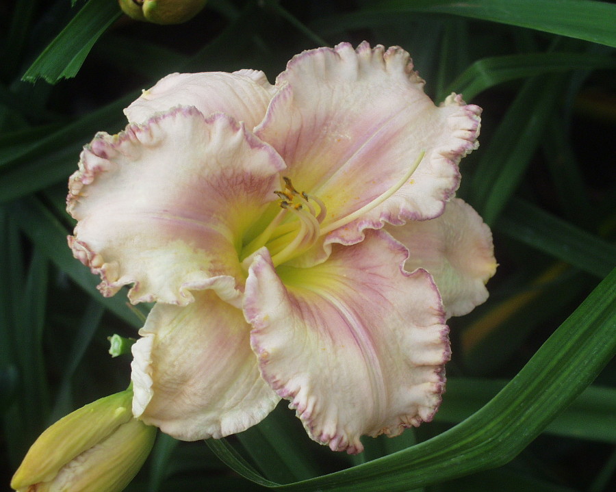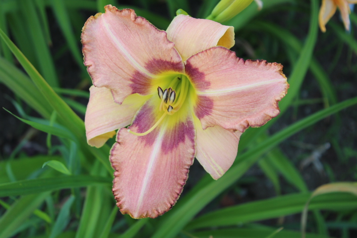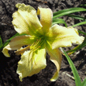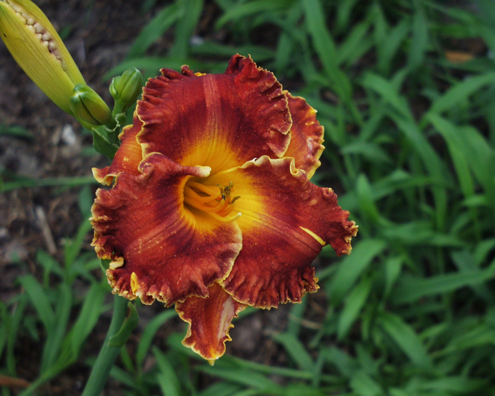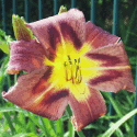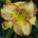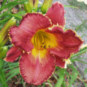reddish yellow blend, reddish eye and reddish wavy edge, yellow green throat