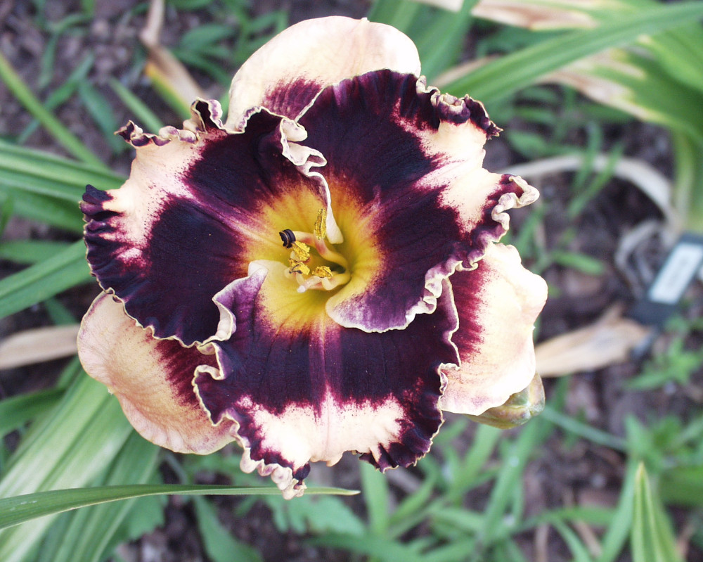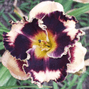 bright yellow-purple blend, black purple eye, black purple border, outer fluted gold edge on the petals, yellow green throat