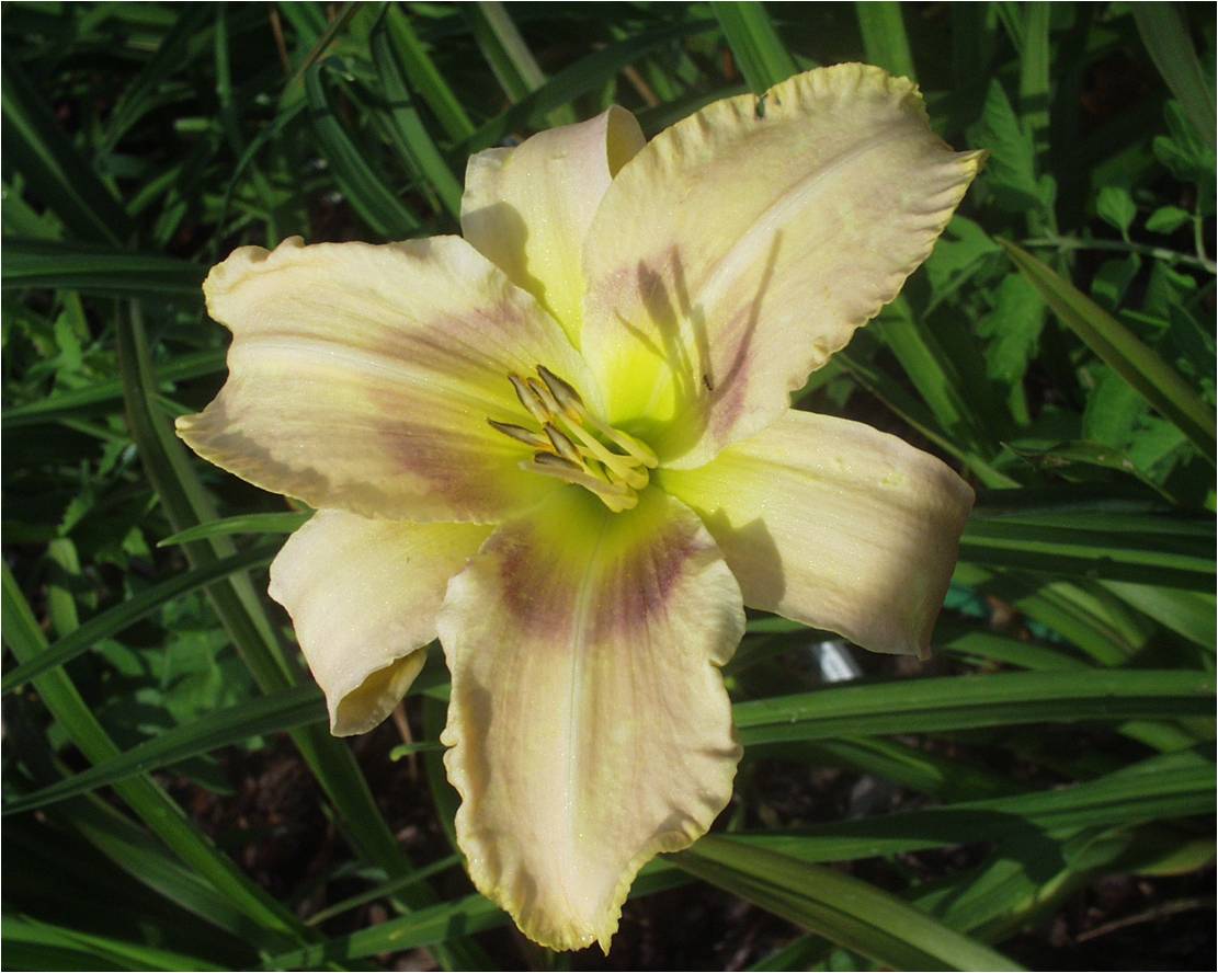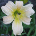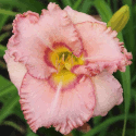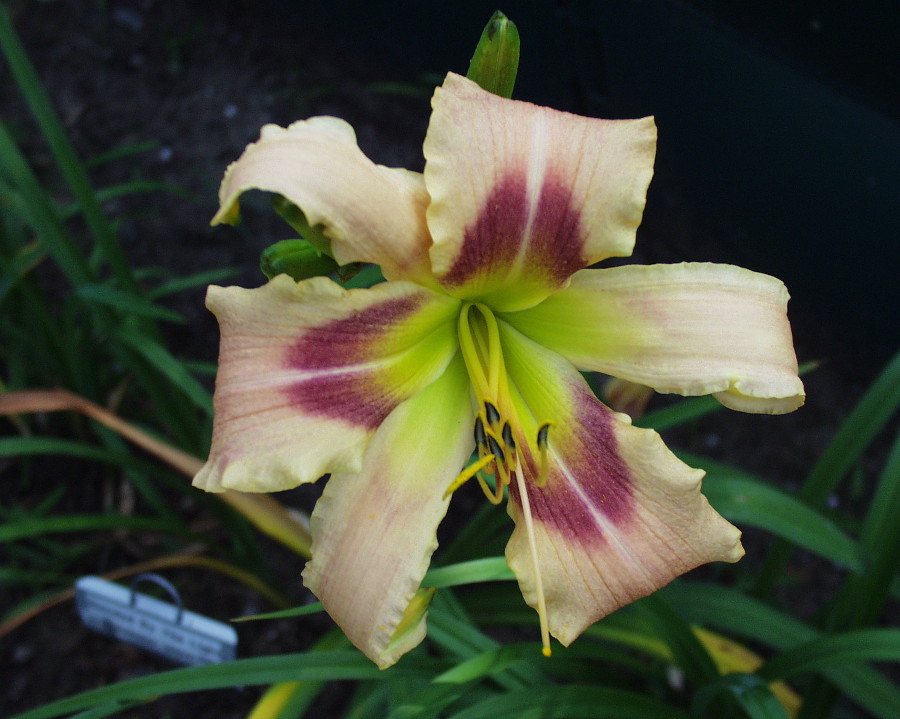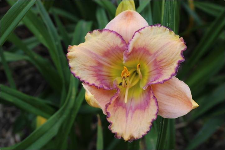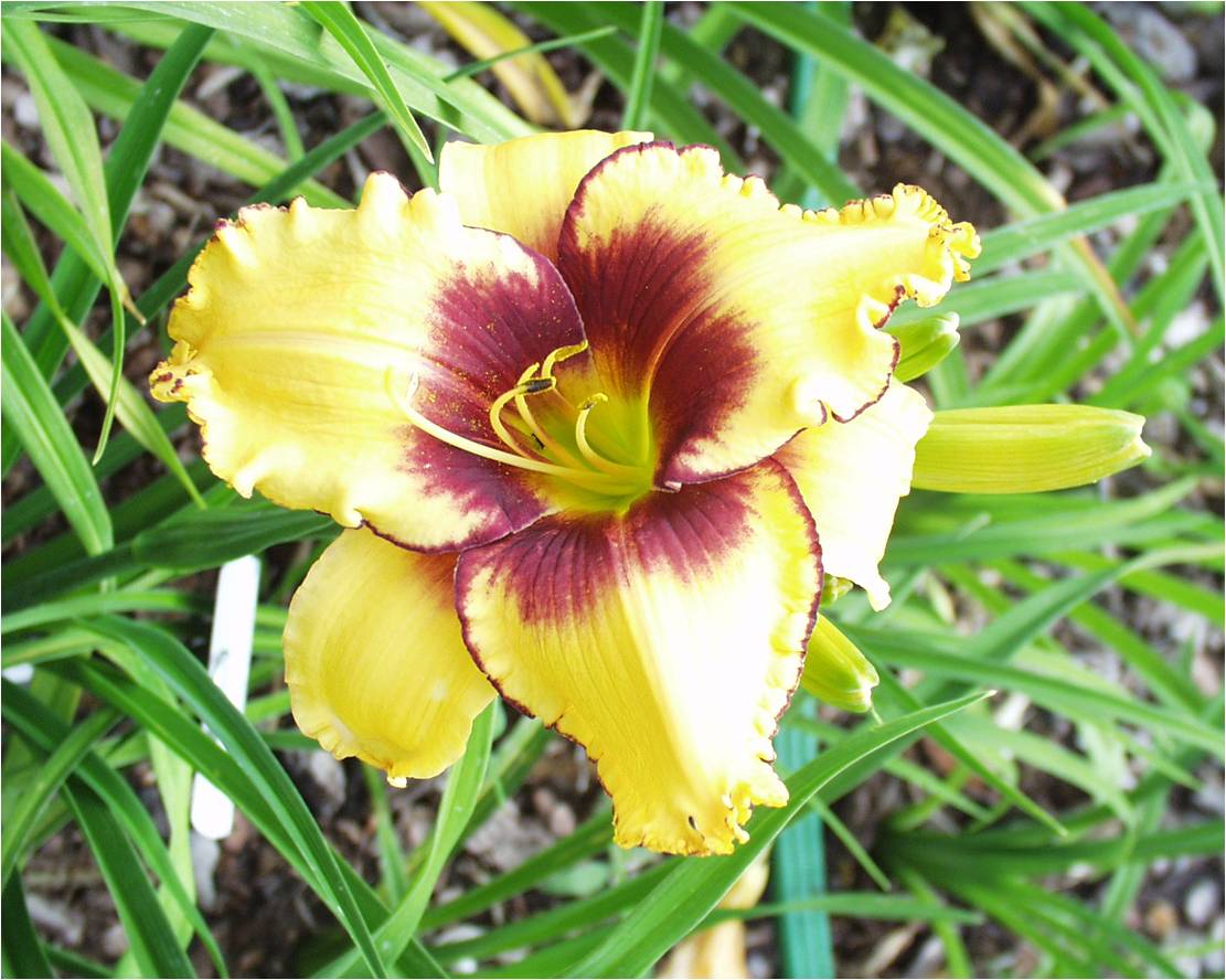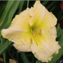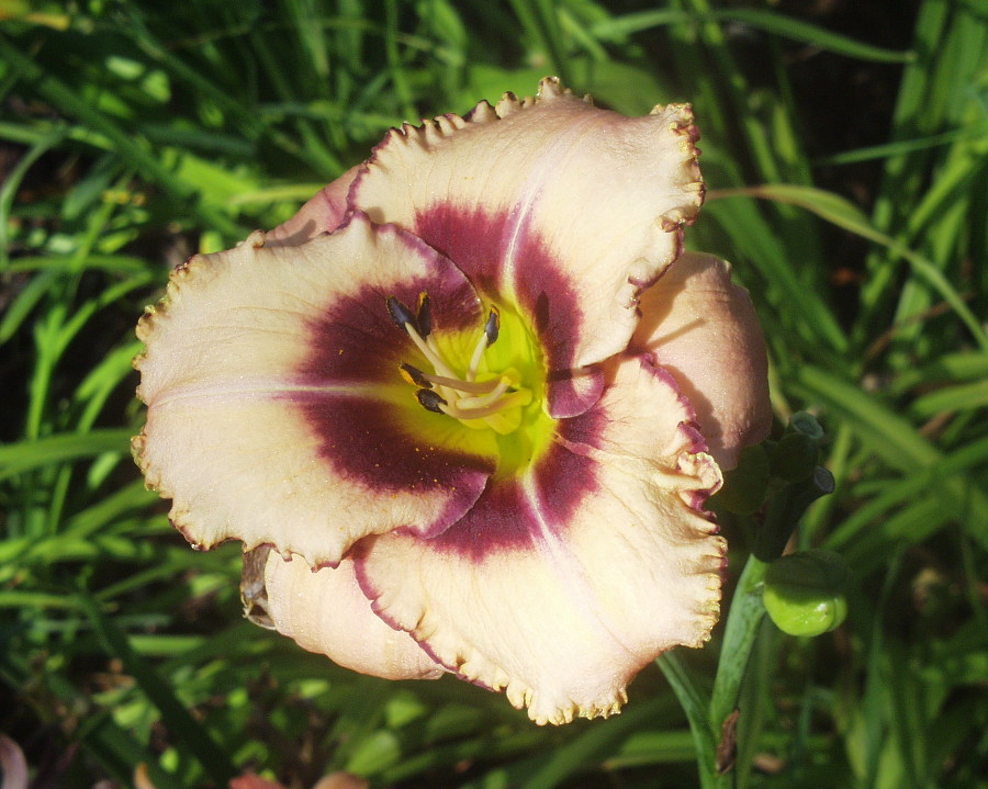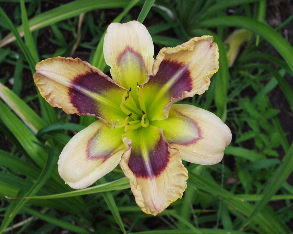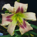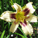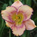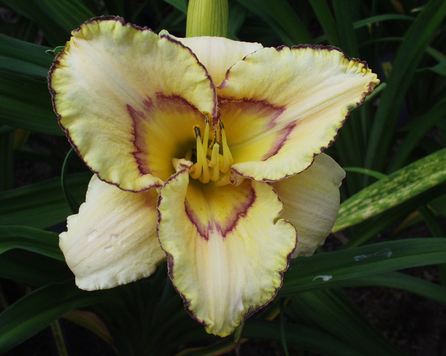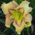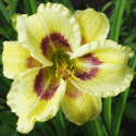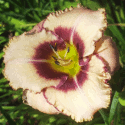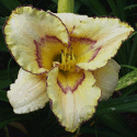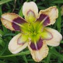 bright cream yellow blend, violet eye, violet edge, yellow green throat
