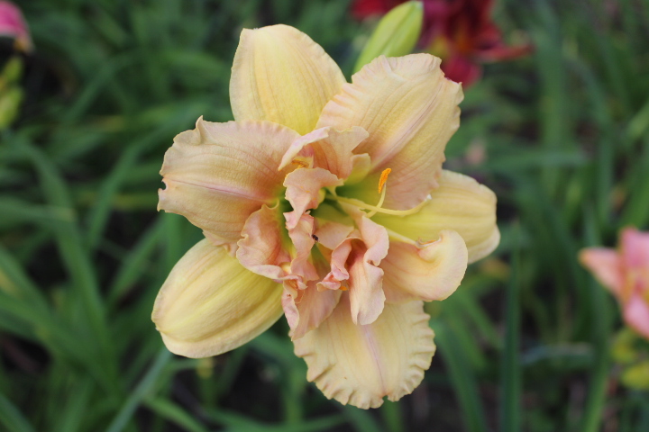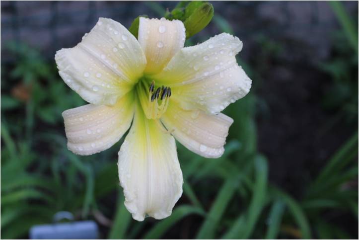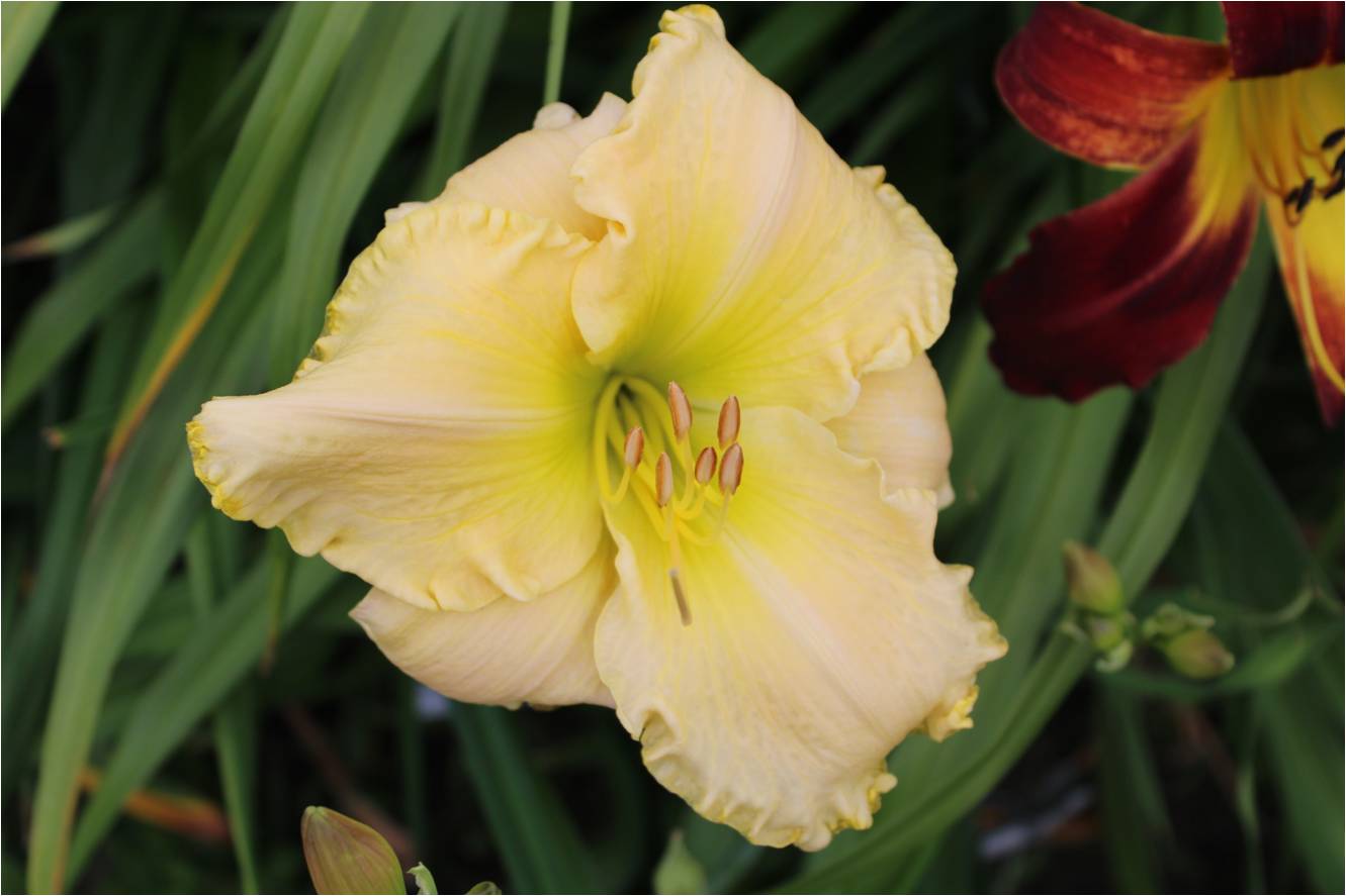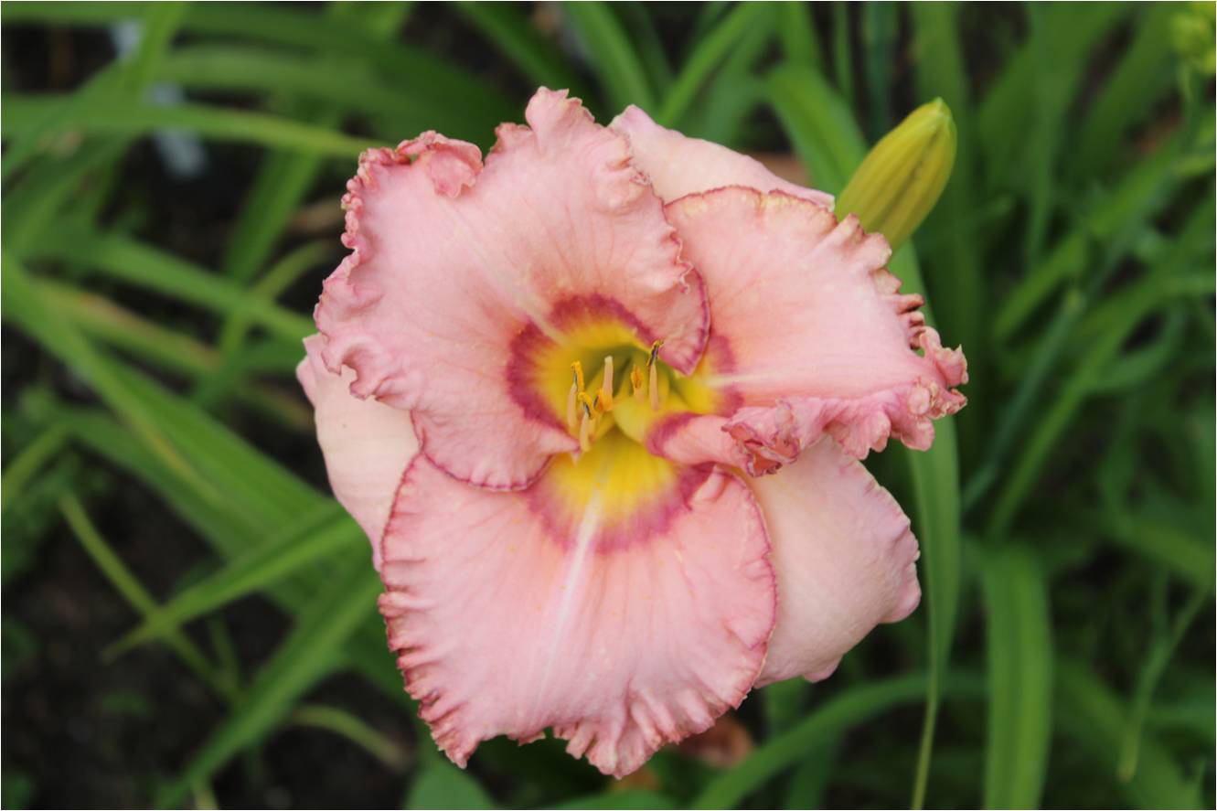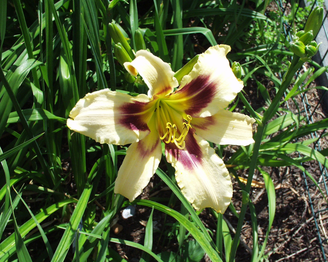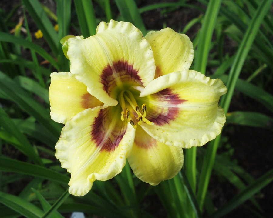 bright cream yellow blend, violet eye, violet edge, yellow green throat