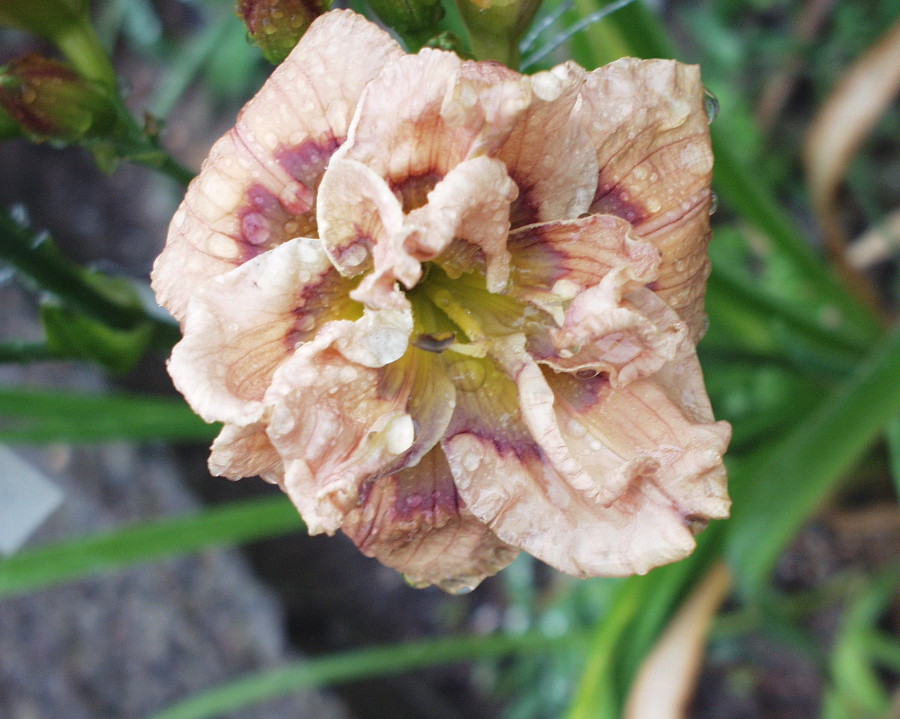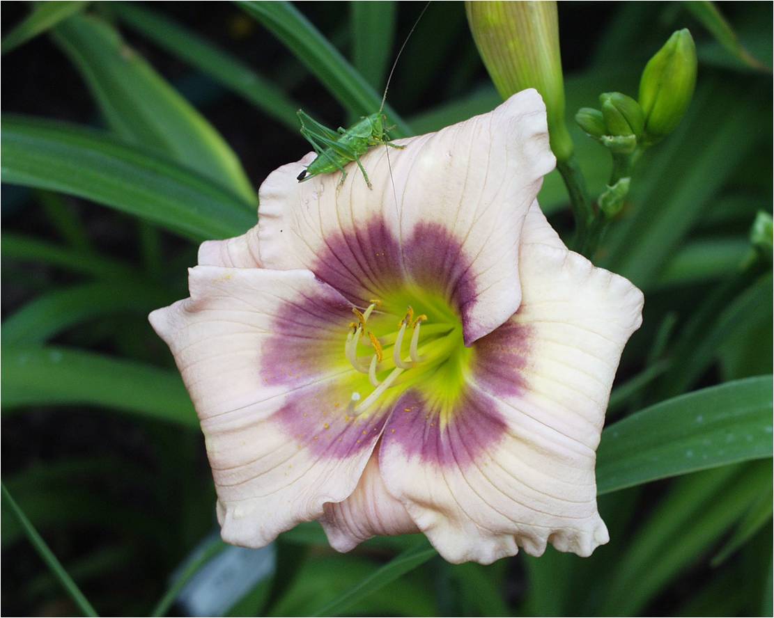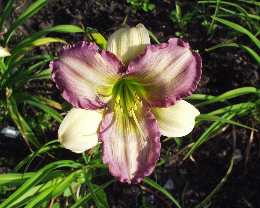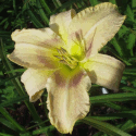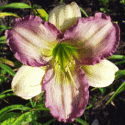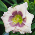 white yellow blend, light violet eye and edge, violet streaks on petals, green throat