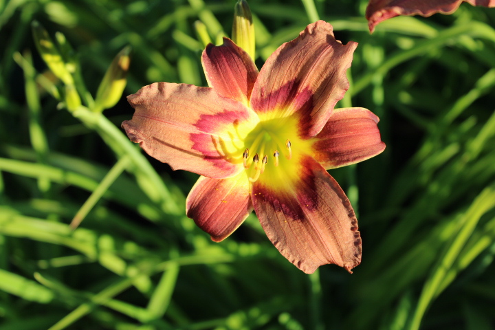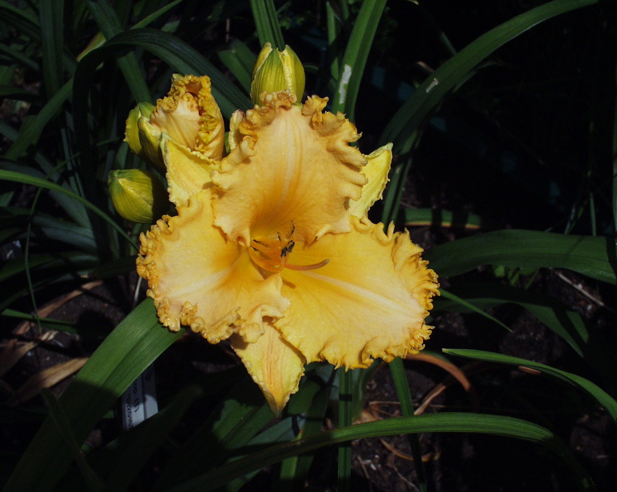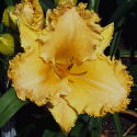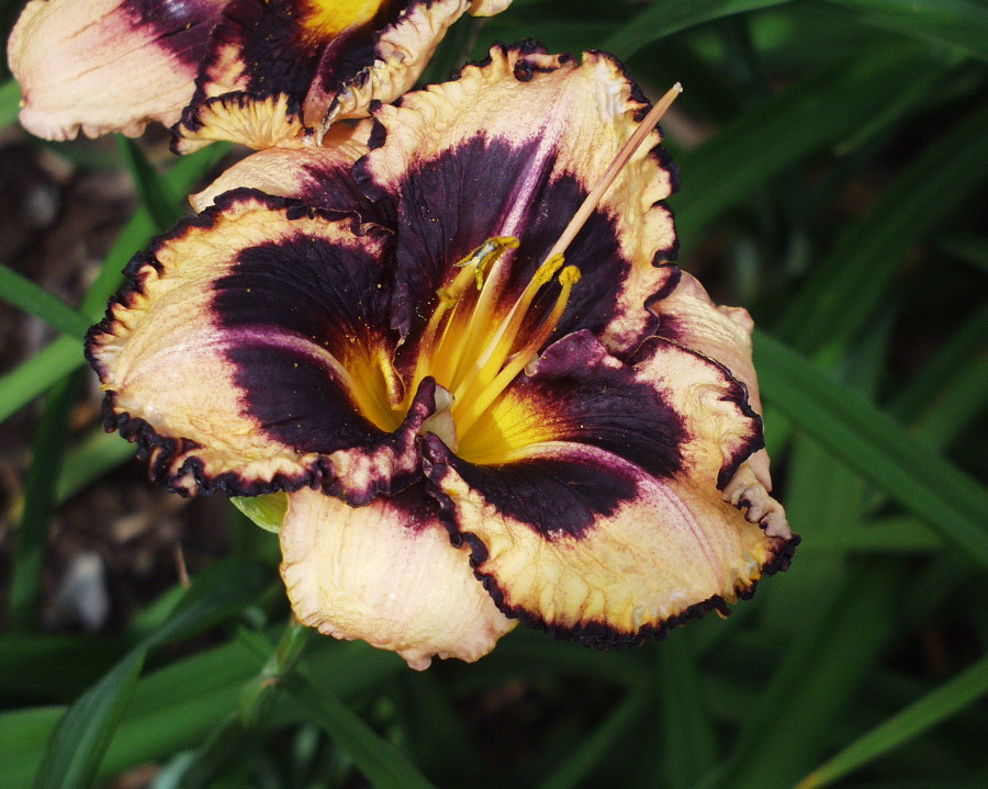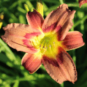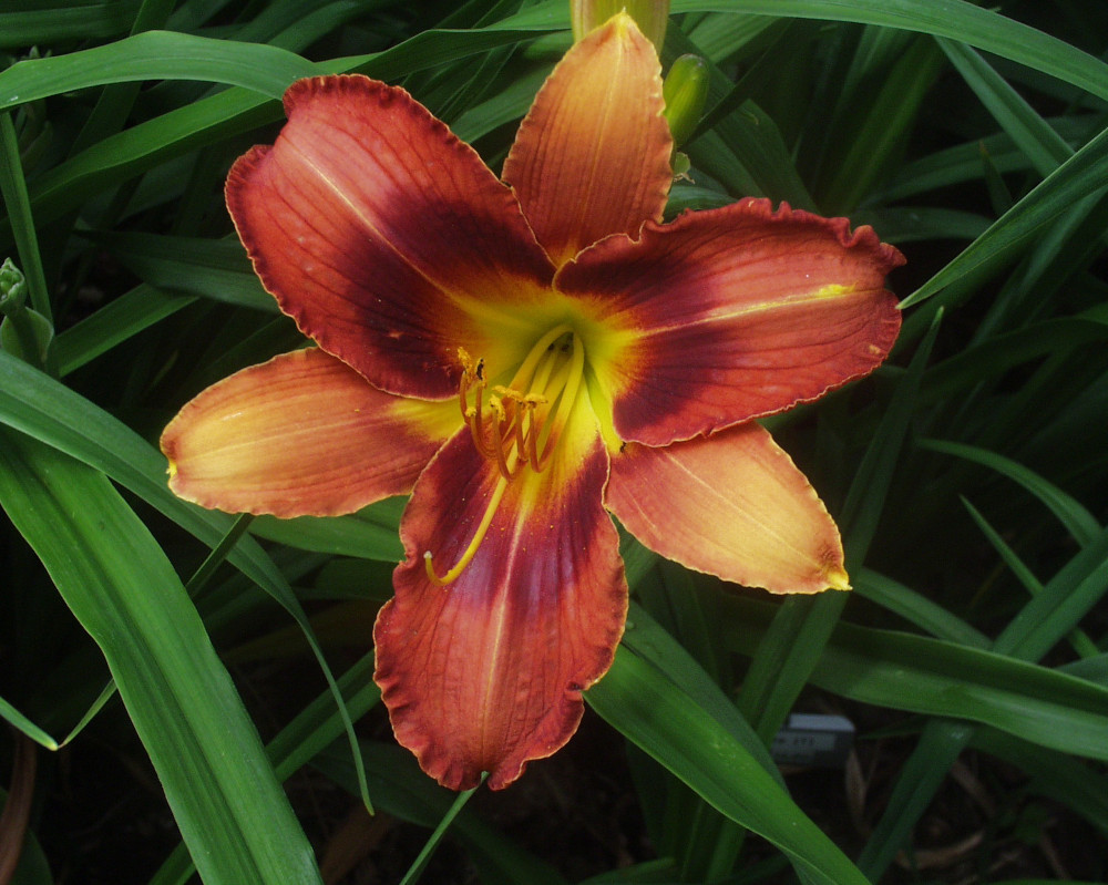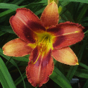 orange yellow blend, orange eye, golden jagged edge, and orange throat