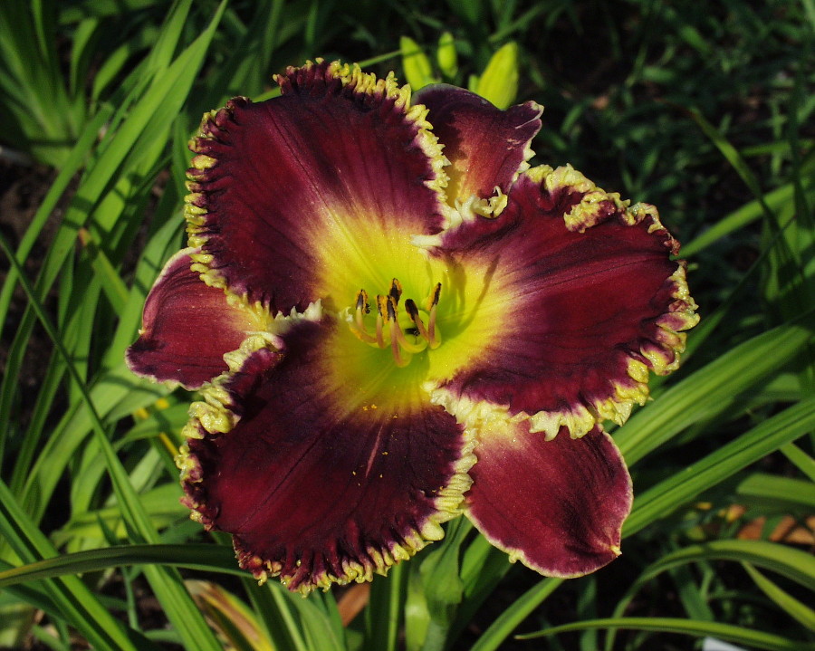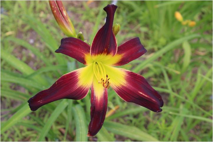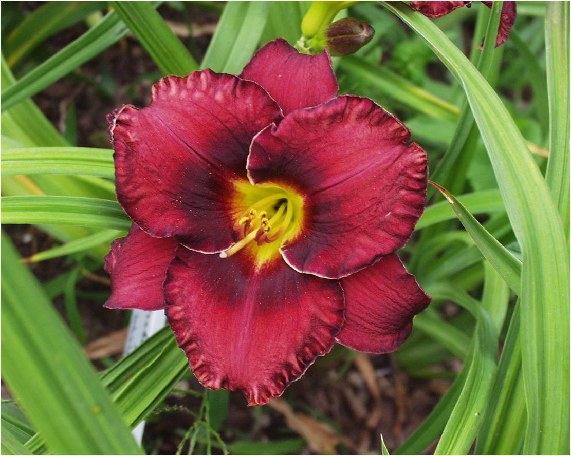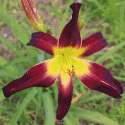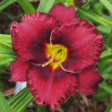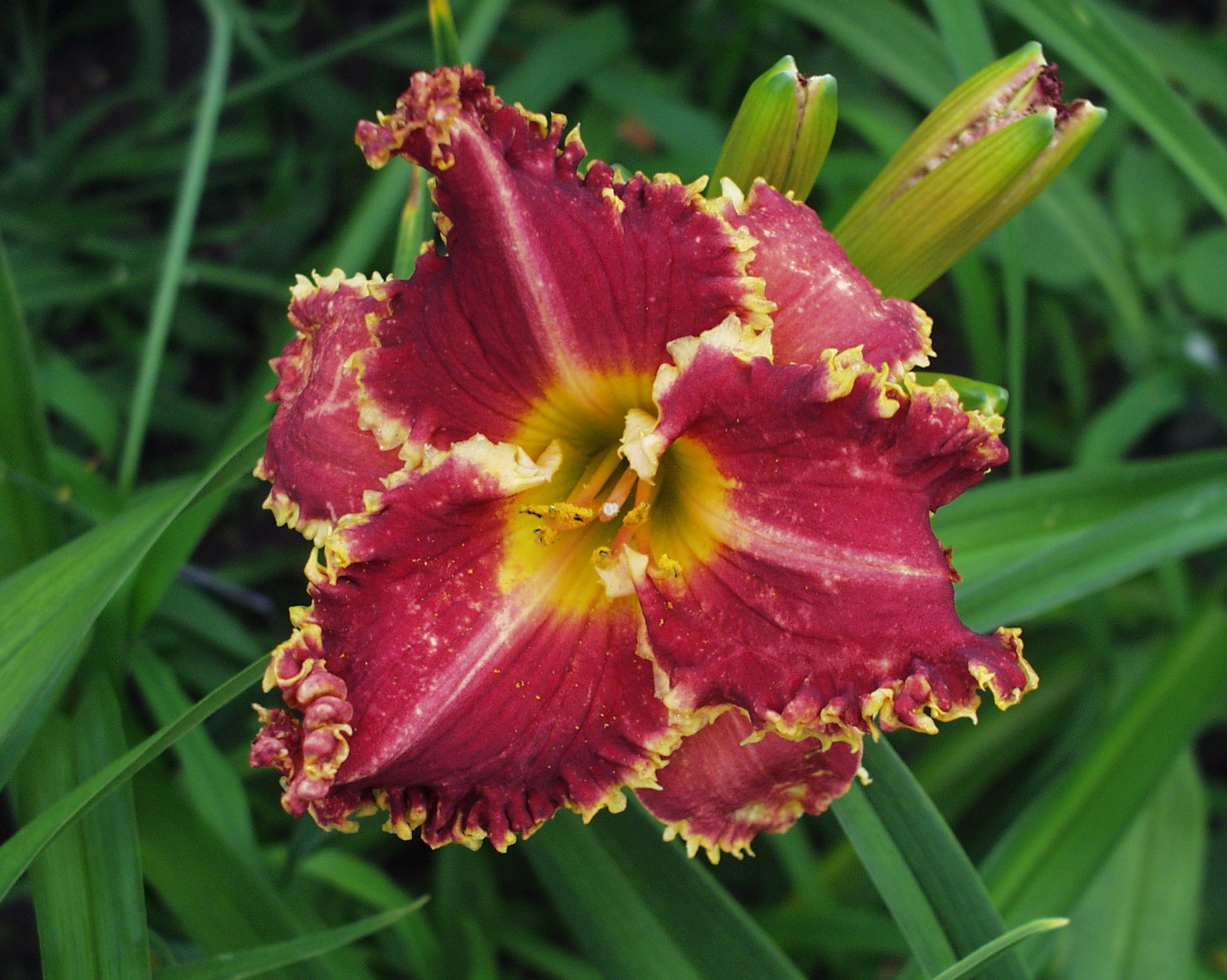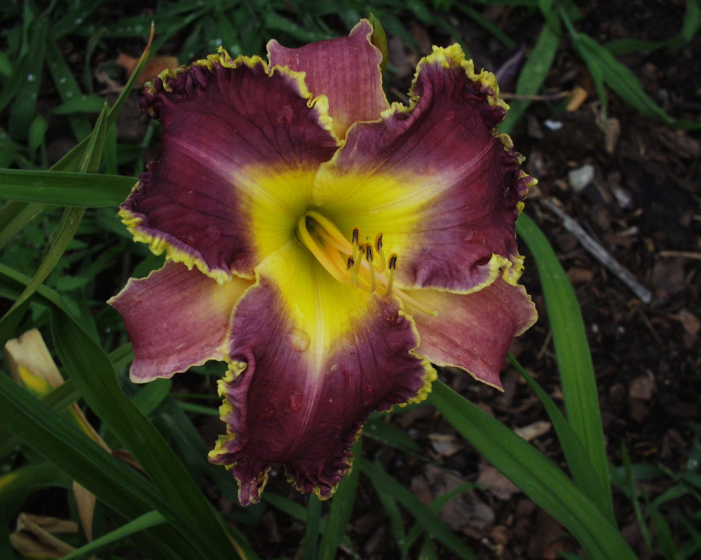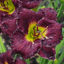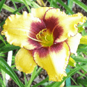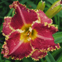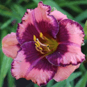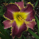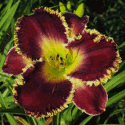 dark violet-red blend, darker eye, strong yellow edge, green throat