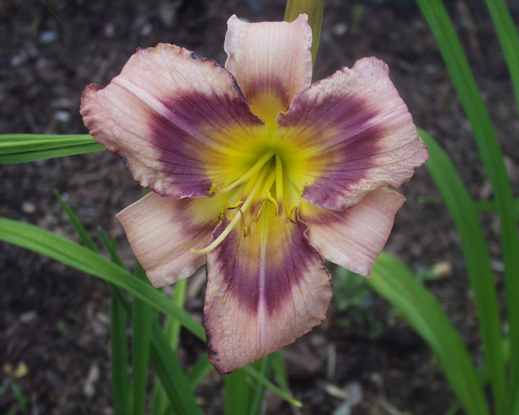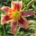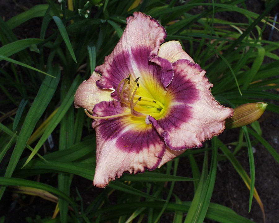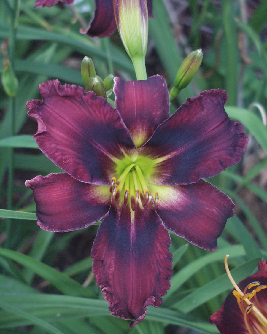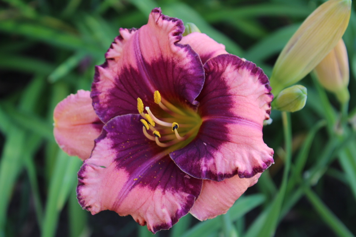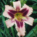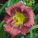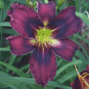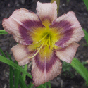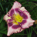 reddish violet yellow blend, dark violet eye and edge, green throat
