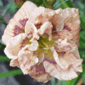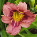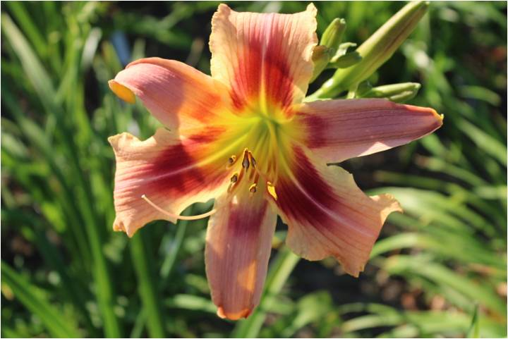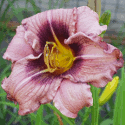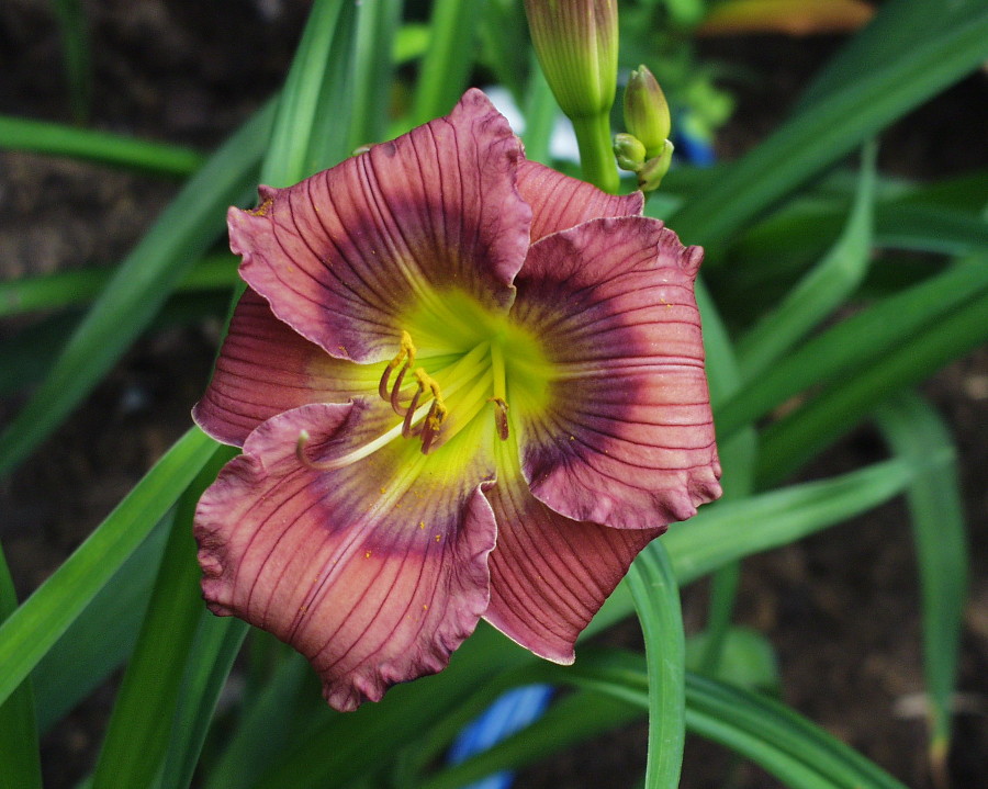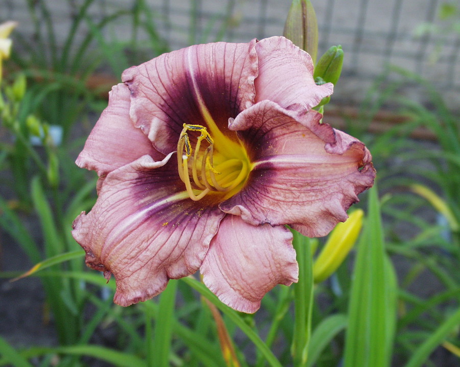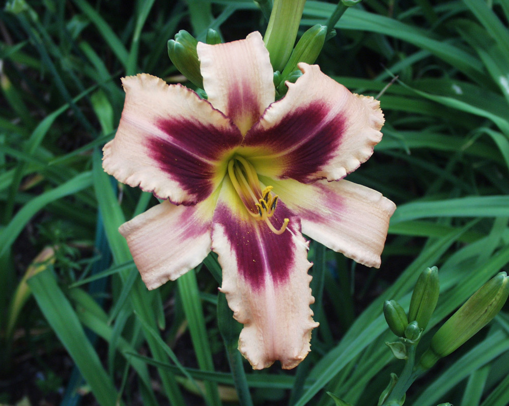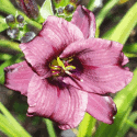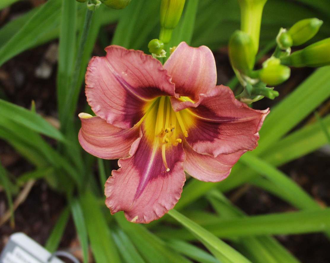 reddish violet yellow blend, dark violet eye and edge, green throat