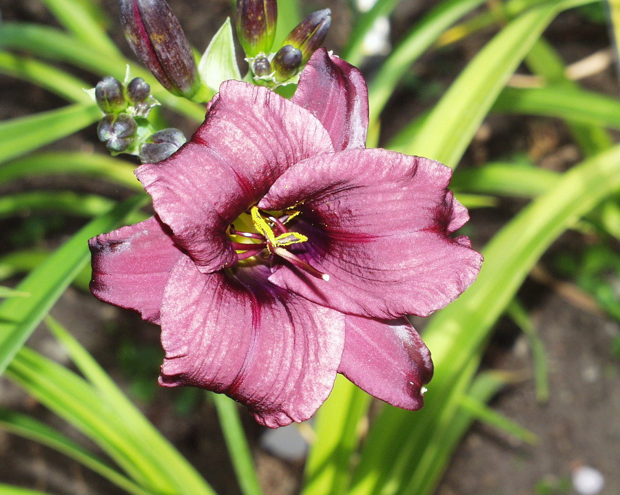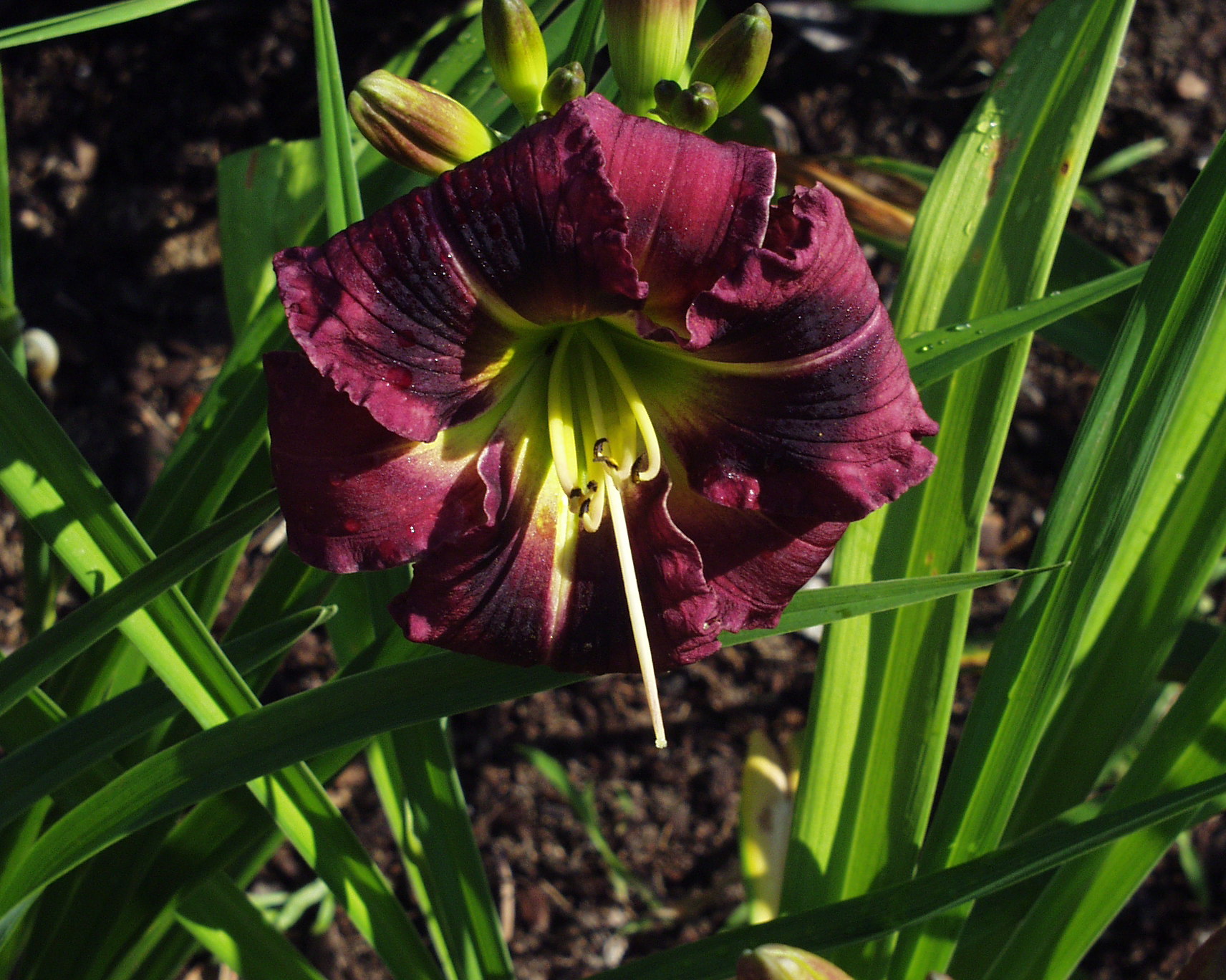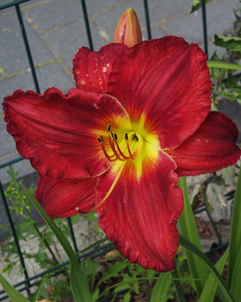 carmine petals and lighter sepals, red purple eye, yellow green throat