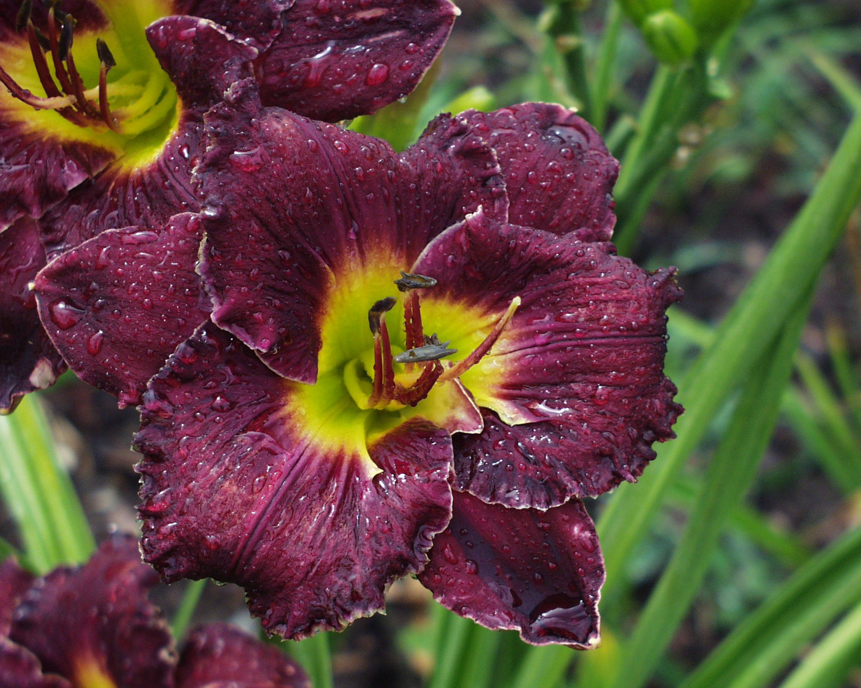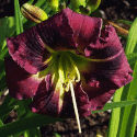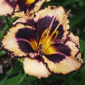 dark violet red blend, dark violet blue band, golden edge on sepals, green throat