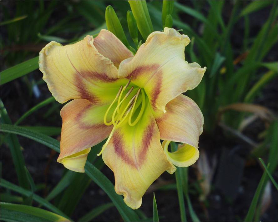light violet yellow blend, yellow area on sepals, violet eye, green throat