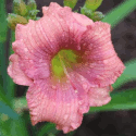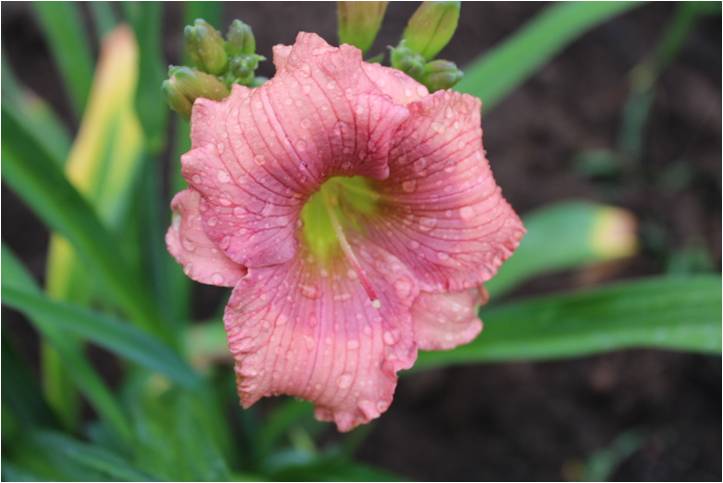 red, lighter streaked on the petals, serrated golden edge, green throat