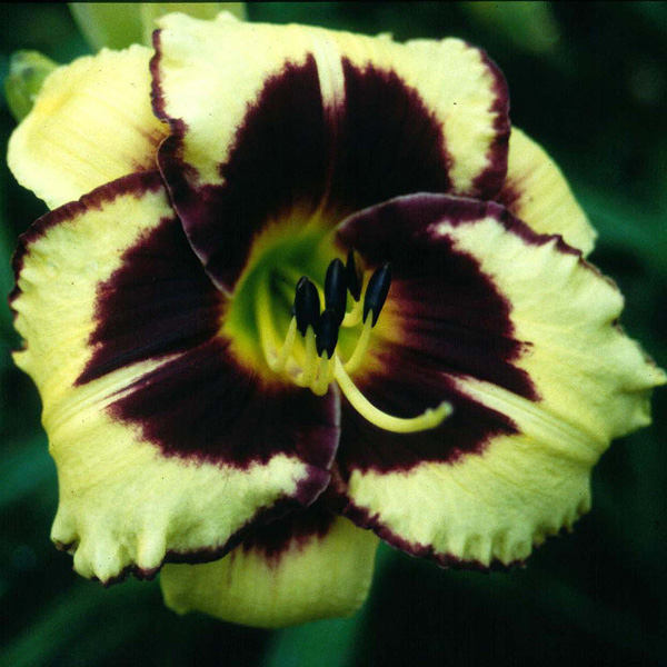 Colour: canary yellow with dark wine purple eye and edge above green throat