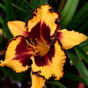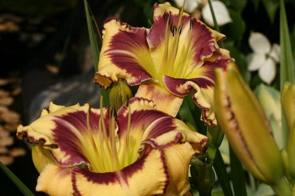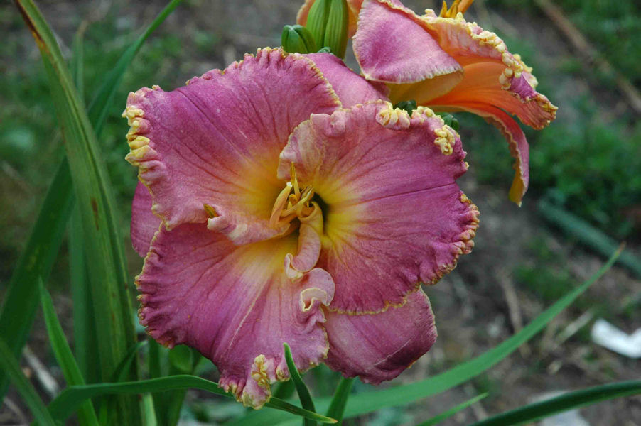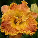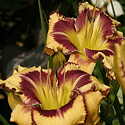 yellow peach blend with appliqued plum eye and golden edge outlined plum above bright green throat