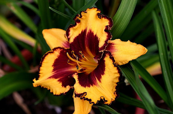 golden yellow with dark plum eye and edge outlined dark burgundy and gold above green throat