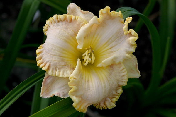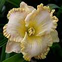cream yellow with blue lavender eye and picotee, amber shading to green throat
